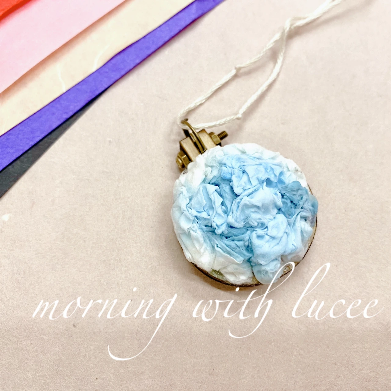 목공풀에 물을 조금 섞어 한지를 버무려서 꽂아주면서 모양을 내는 것이다. 목걸이 줄은 가죽 끈을 주문했다. 리넨 원피스에 잘 어울리는 것 같다. 어제 퇴근 후 만든 것이다. 마르지 않은 상태에서 사진을 남겼다. 마르면 좀 더 환해질 듯하다.