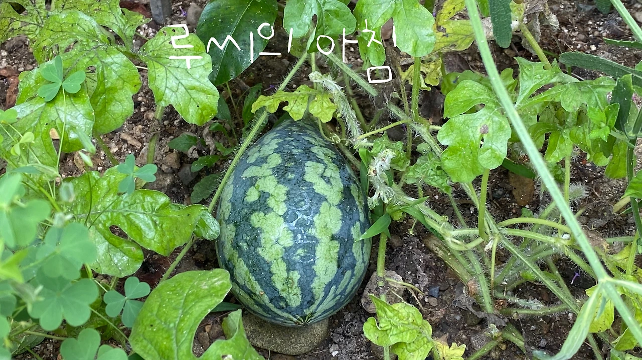 텃밭에는 내가 심어 자라고 있는 수박의 색이 진해지고 있다. 원래 노지수박은 당도도 떨어진다고 한다. 크기가 매우 작지만 신비롭기 그지없다. 아까워서 보기만 한다.
