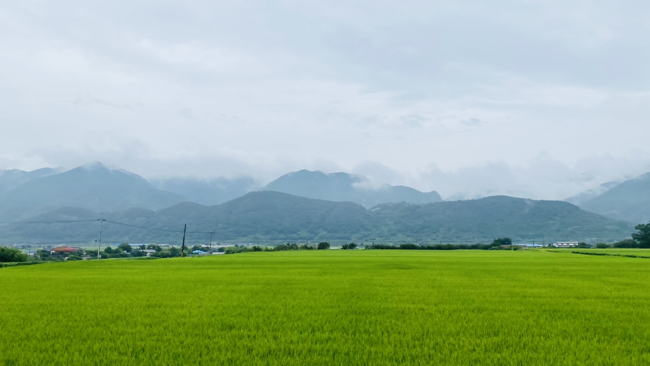 곧 벼가 익을 것 같다. 멀리 지리산 자락이 보인다.