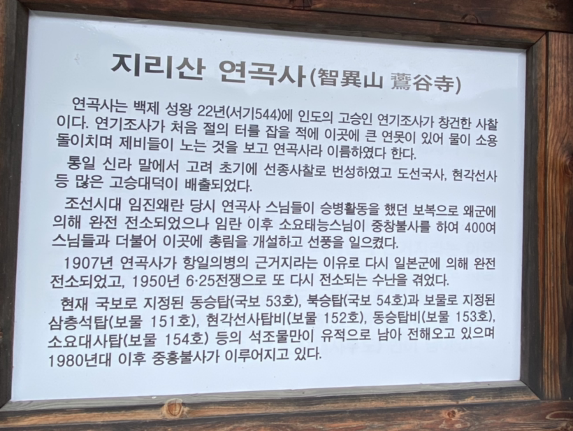 드디어 연곡사에 도착했다. 연곡사에 대해 적힌 글을 요약해본다. 한마디로 목조로 지어진 절의 수난의 역사가 기록되어 있다. 그중 유난히 눈에 띄는 부분은 왜구의 침략에 맞서 싸운 승병의 활약과 연곡사가 항일 의병의 근거지였다는 부분이다.