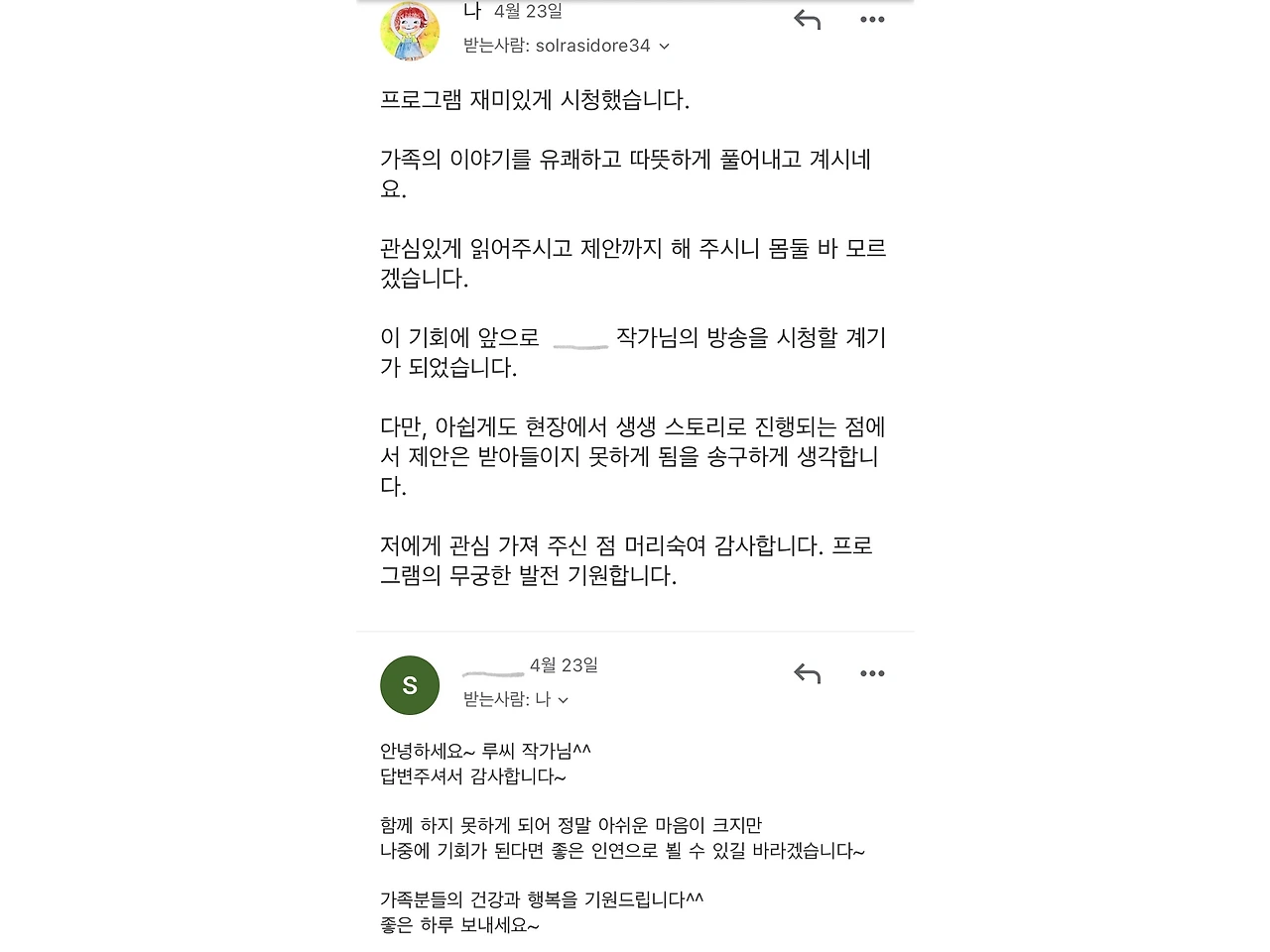 지난 4월 EBS 방송국 어느 프로그램 작가님이셨습니다.(작가님의 성함이나 프로그램을 밝혀야 하는지 어떤지 알 수가 없어서 그냥 알리지 않도록 하겠습니다.) 저의 글을 어찌 읽으셨는지 방송 제의를 해 주셨습니다. 이에 대해서 답글을 드렸고 저에게 다시 답글을 친절히 해 주셨습니다.