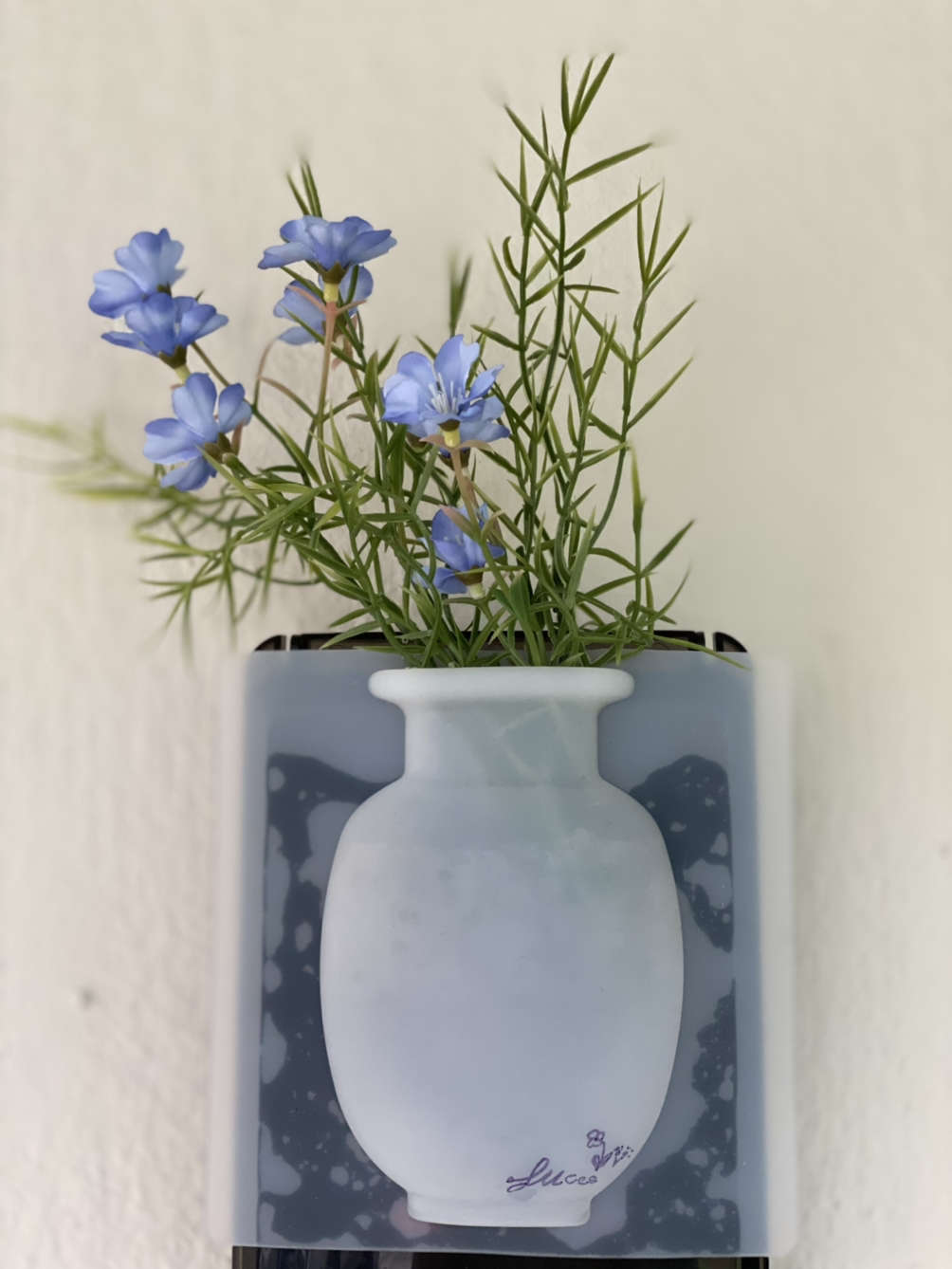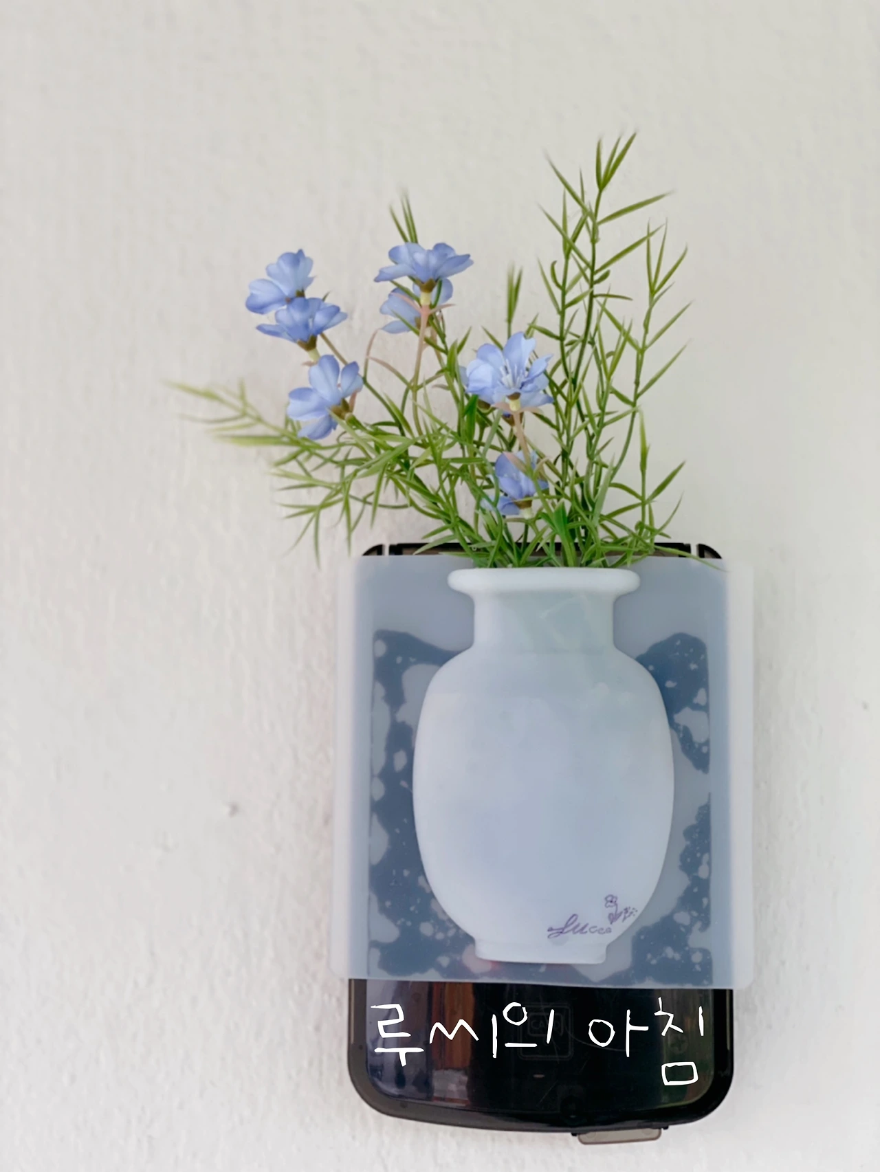 키 패드 박스가 멋이 없어서 실리콘 납작 화병에 조화를 꽂았다. 아래엔 나의 싸인을......(납작 실리콘 화병은 어느 카페에서 얻은 것이다.)