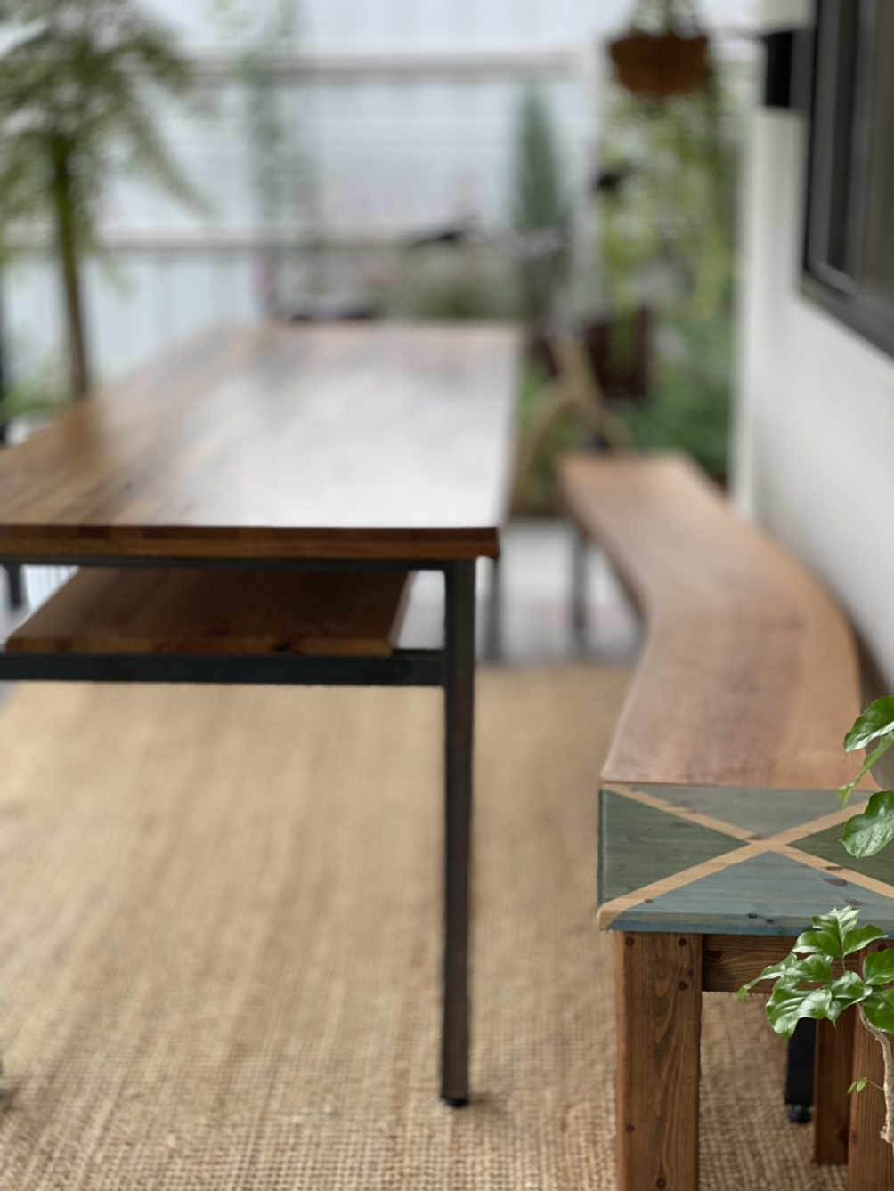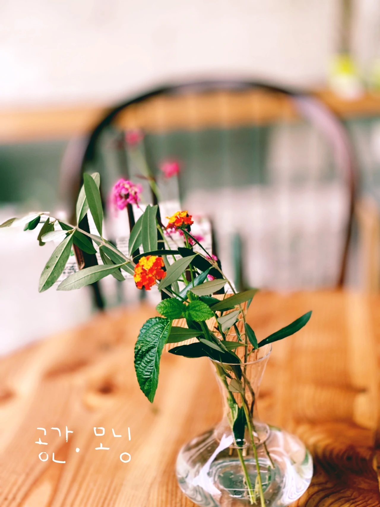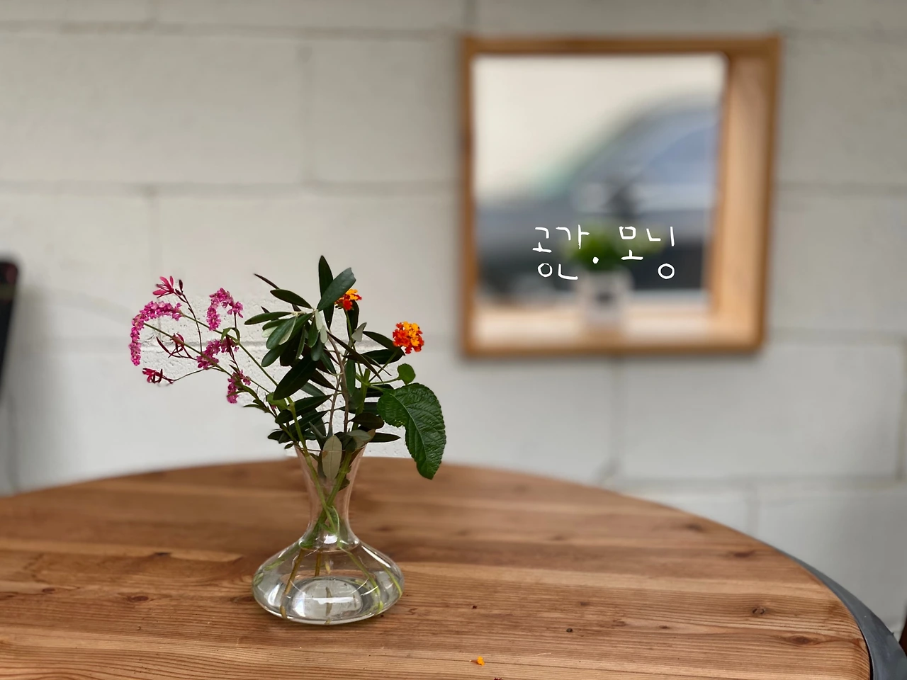 화단 정리를 조금 했다. 아까운 꽃들을 화병에 꽂는다. 사실 이건 화병이 아니라 와인 디켄터다. 테이블은 어디서 얻은 것인데, 남편이 나무로 리폼한 것이다.