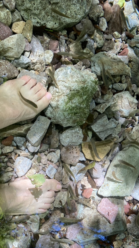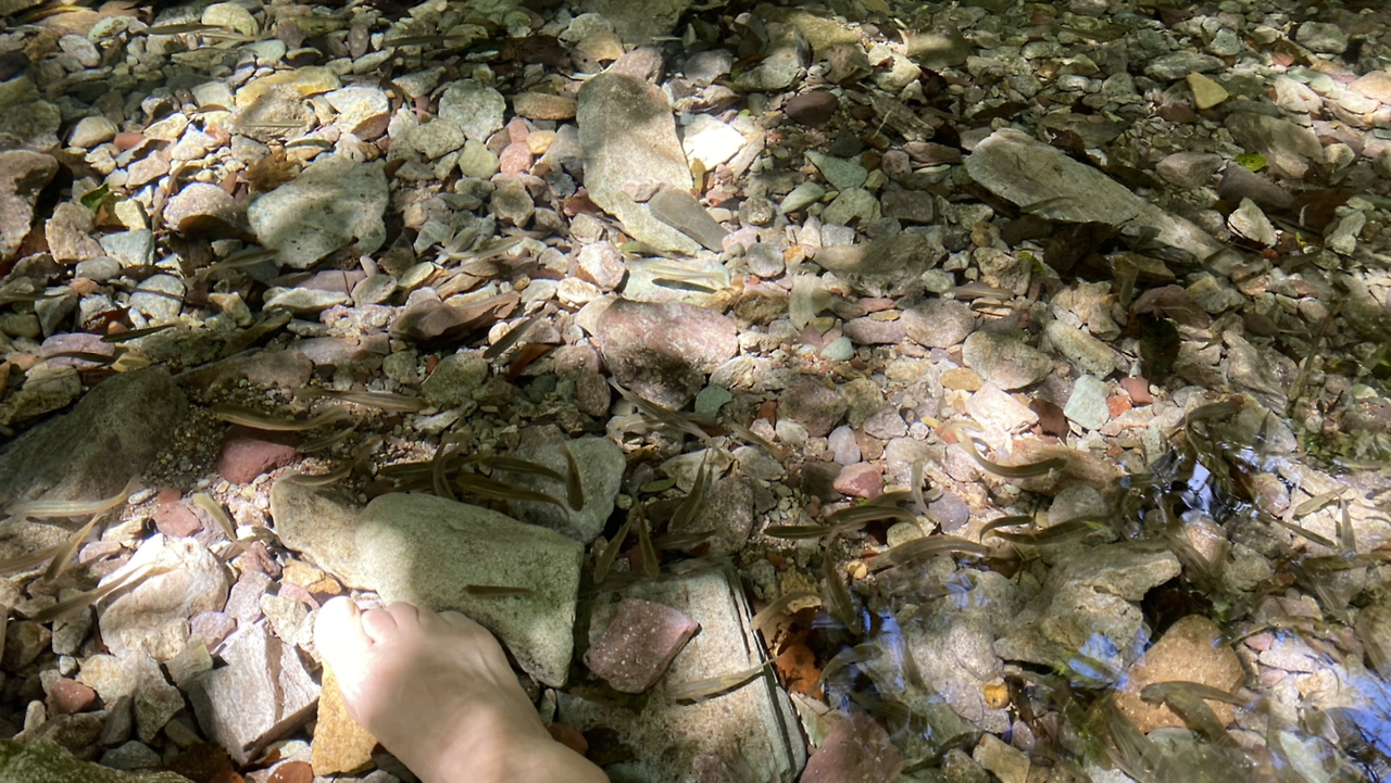 자리를 비켜 드리니 엄마, 아빠, 딸아이 세 가족이 나란히 앉는다. 물병 하나 들고 앉아 물고기를 잡았다 풀어준다. 돗자리 펴고 바로 발을 담그면 된다.