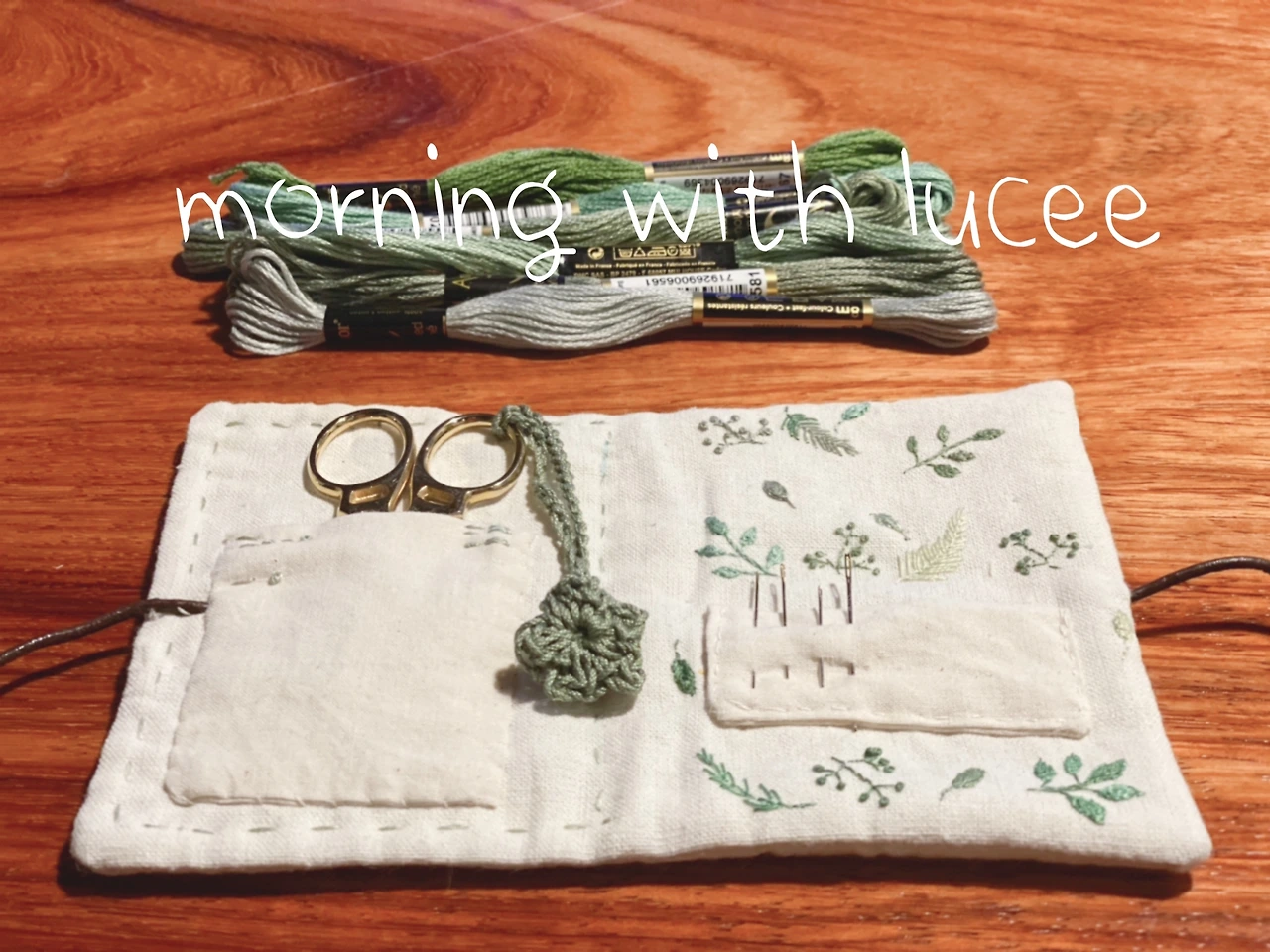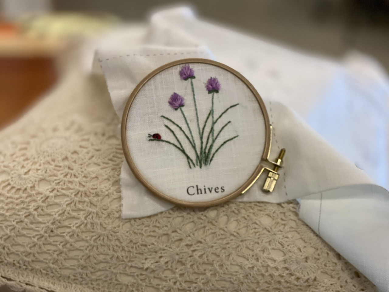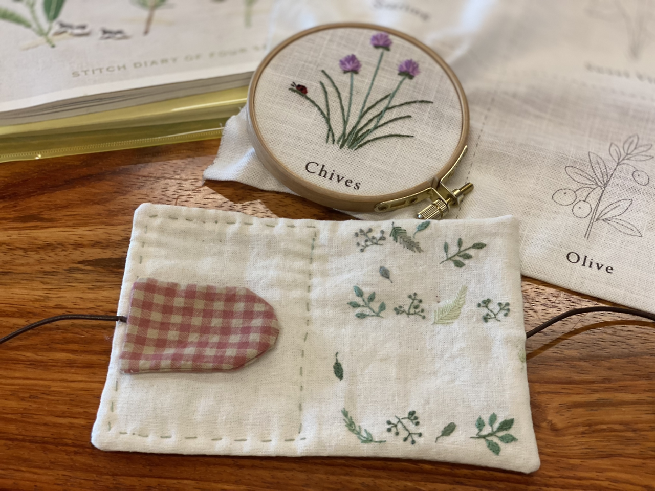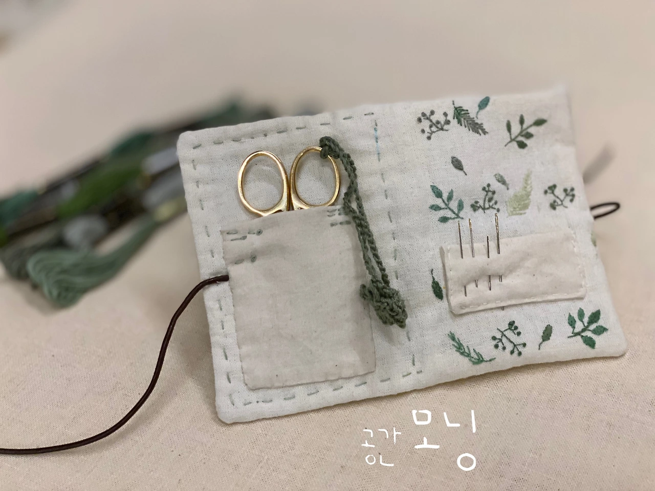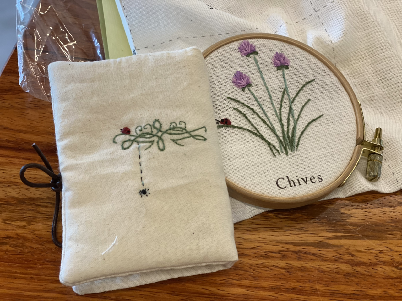 도안이 프린트되어 있어서 초보자들도 하기에 쉽다. 자수실의 번호까지 쓰여 있으며 실이 패키지에 들어 있기에 수월한 편이다. 아무리 도안이 있다지만 자수는 손끝의 미세한 터치에 따라 달라진다. 적절한 감각이 필요하다. 어떤 색을 어디에 놓느냐에 따라 느낌이 달라진다. 나의 조언과 친구의 야무진 손 느낌으로 친구가 첫 수를 놓았다. 차이브(chives)는 허브의 일종이다.
