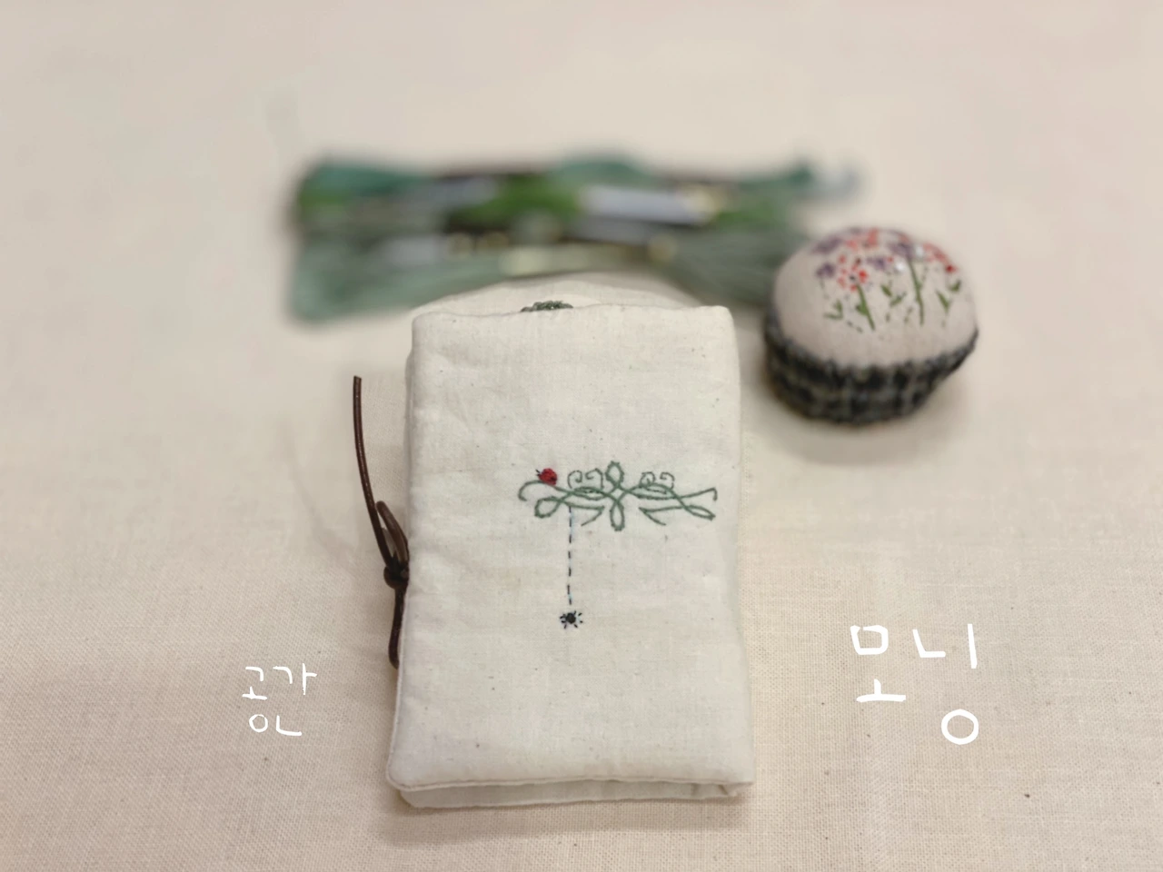 헬로 해피의 ‘처음 프랑스 자수(143페이지)'에서 바늘, 가위 집 수첩은 내가 작업했다. 헬로 해피 시리즈 책들은 귀여운 이미지가 많아서 좋다. 도안은 그냥 천에 직접 그려서 했으며 원본에 아주 충실하지는 않았다. 예를 들면 거미가 내려온다거나 무당벌레 한 마리를 넣는 것이 나의 방식이다.