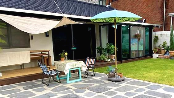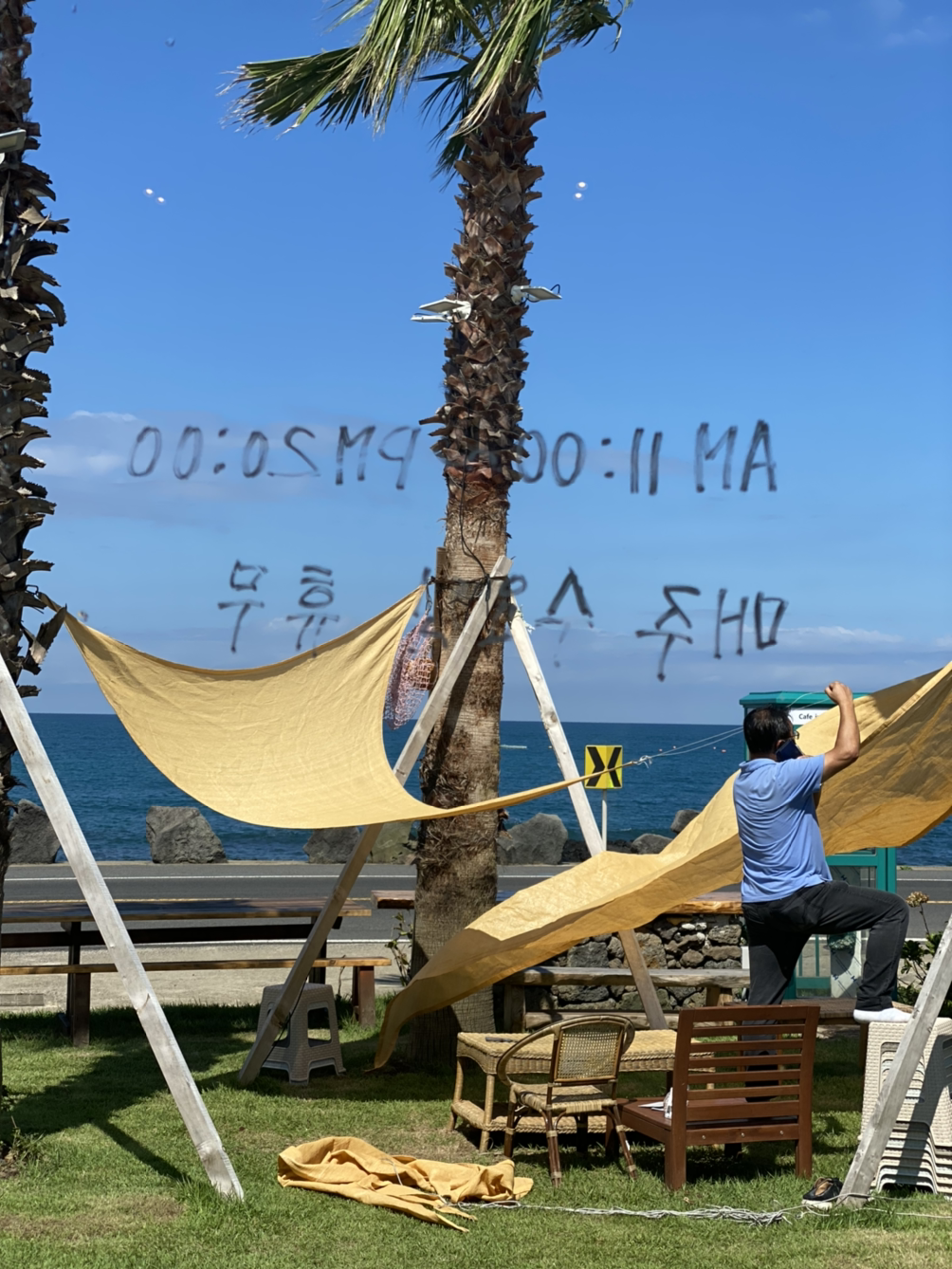 바닷가가 시원하게 보이는 곳에 있던 제주도 카페의 타프가 예뻤다. 여쭤보니 가격이 생각보다 저렴했다. 여행에서 돌아오자마자 우선 하나를 주문해 보았다. 황토색을 주문한 것 같은데 베이지 색이 왔다. 3미터를 주문했는데 생각보다 작아서 끈을 어찌할까 이쪽에 매어 보았다가 저쪽에 매어보았다가 하다 보니 한 시간이 흘렀다.