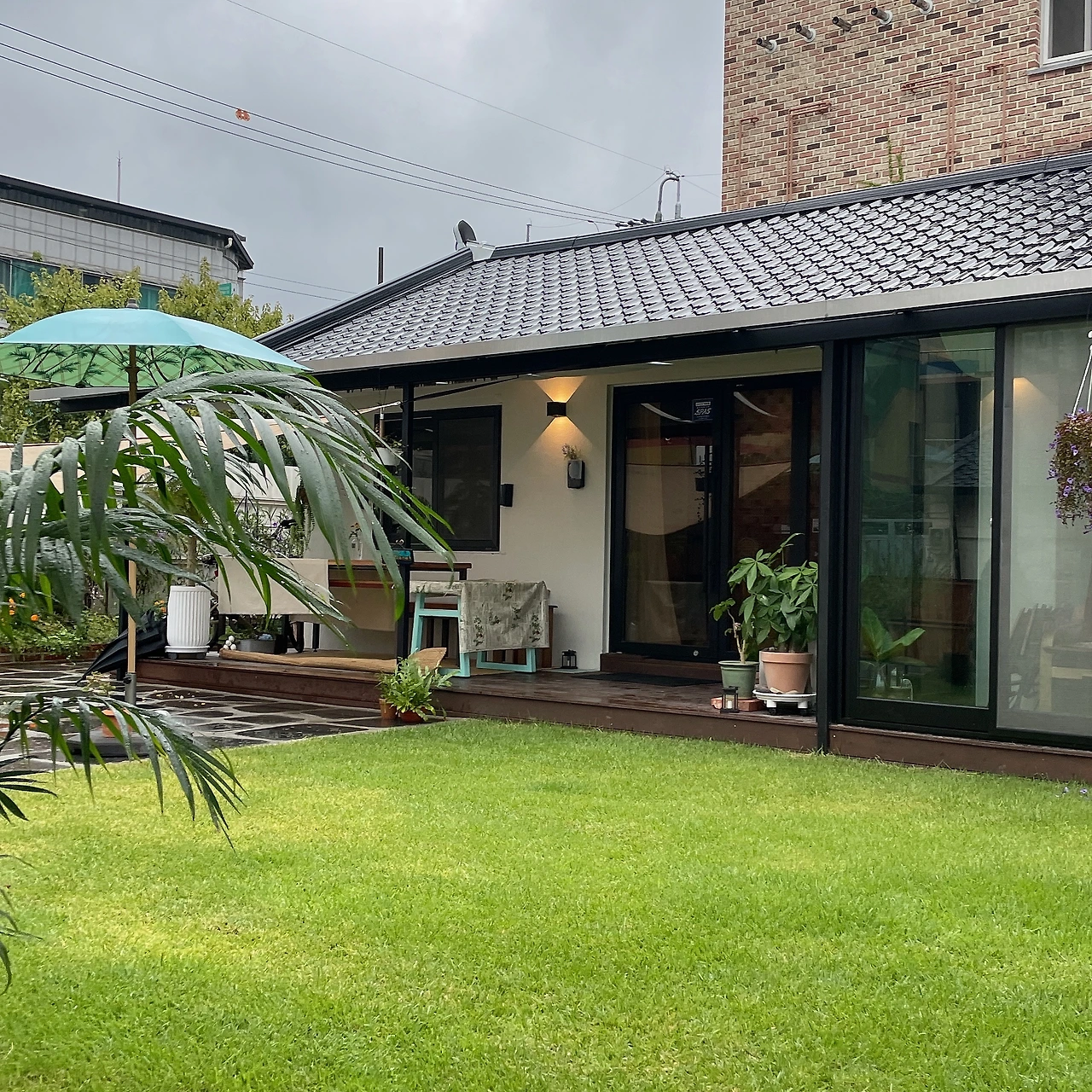 나무 기둥을 세워 전기선을 안 보이도록 뒤로 연결했다. 전깃줄이 보이지 않아서 더 아름다운 카페다.