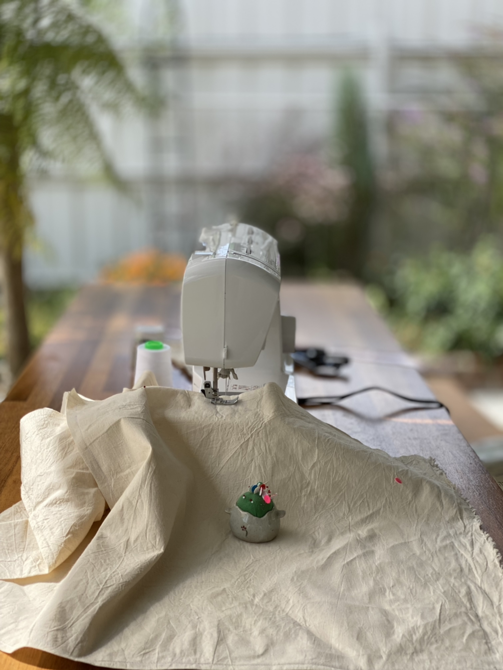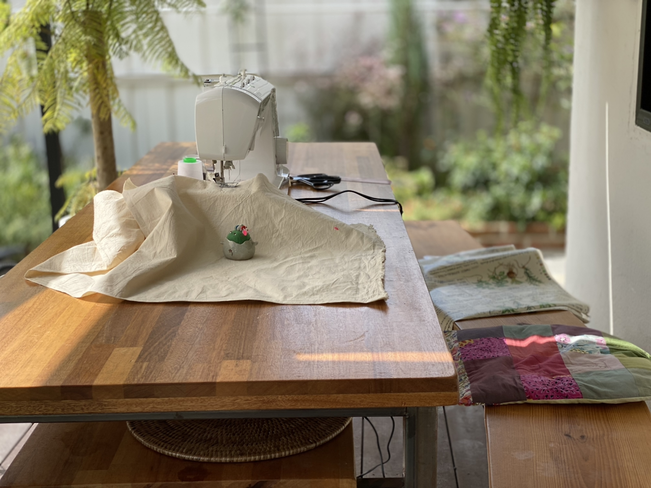 재봉틀질은 먼지가 날리기 때문에 날이 좋은 경우에는 외부 나무 데크 위에서 작업한다.