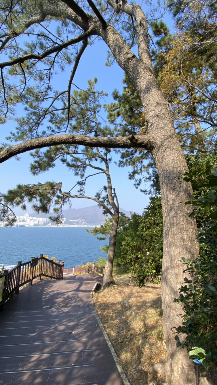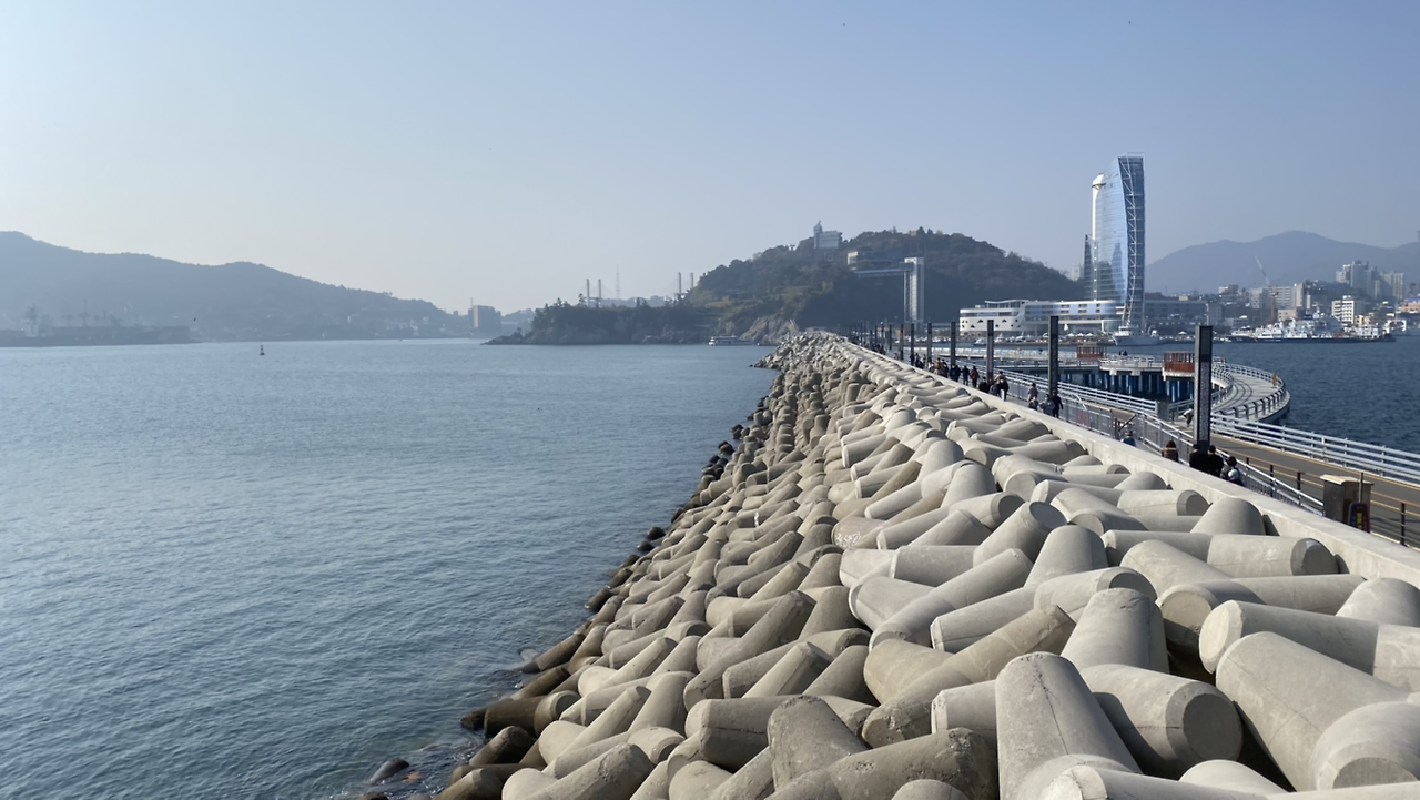 우리도 사실 얘네들 구경하다가 20분 가까이 소모했다. 그래서 한 시간 후의 버스를 타려다가 두 시간 후의 버스를 타기로 했다. 오동도 입구까지 운동삼아 걸어가기로 했다. 방파제를 따라 걸어서 입구 쪽의 버스 타는 곳에 다 달았다.