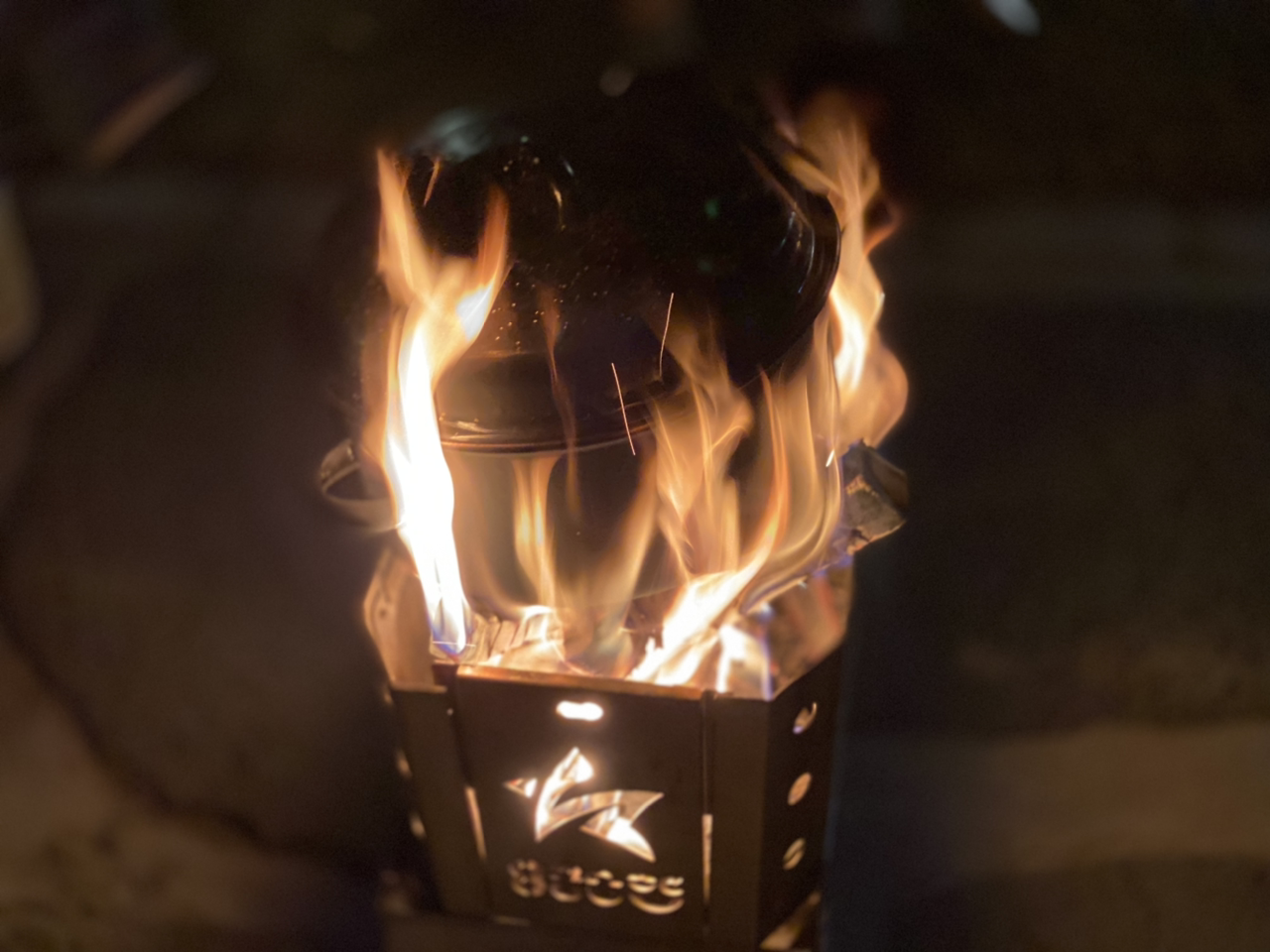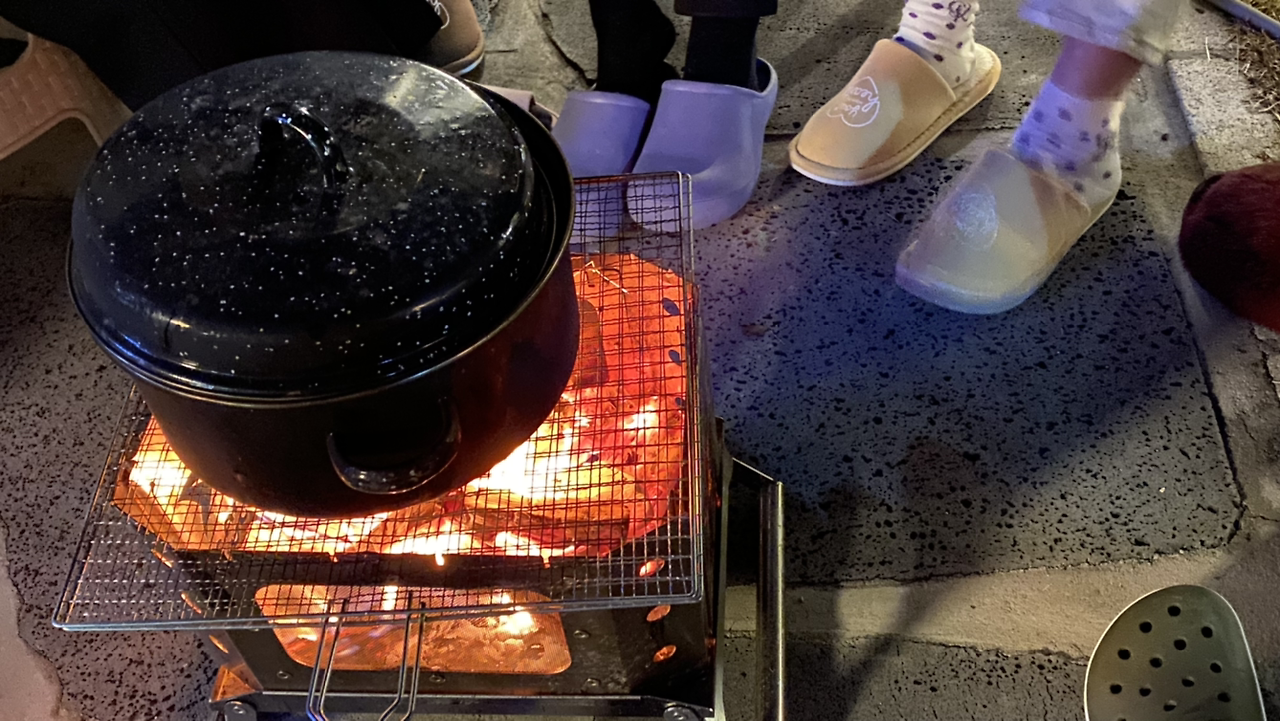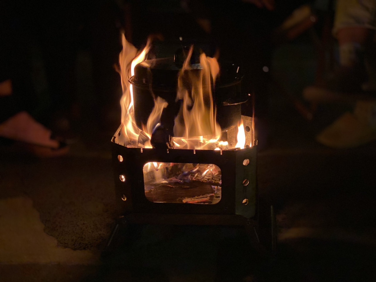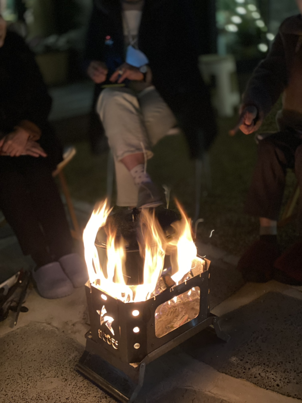 재밌게 놀고 떠드는 사이 밤이 되어 '모닝'간판에 불이 들어왔다. 내가 직접 불 피워보기는 처음이다. 착화제 두 알을 넣고 불을 붙였다. 시골 농막에서 가져온 장작은 활활 잘 타올랐다. 아주 작은 불멍 화로라서 심하게 불이 타 오르지는 않고 적당하다.