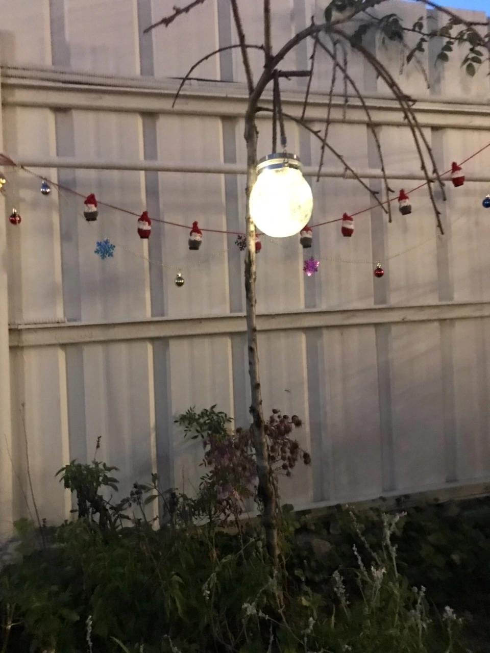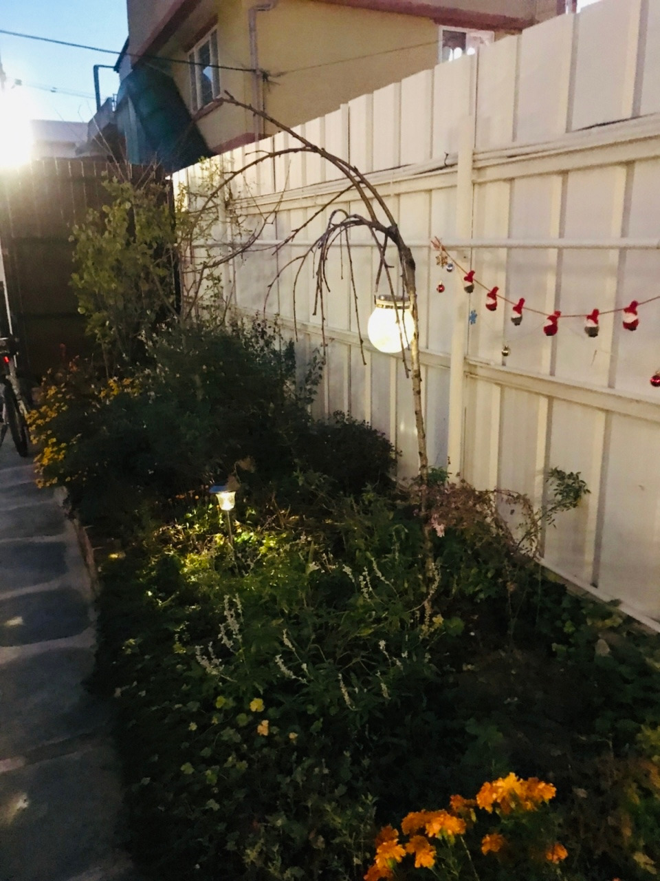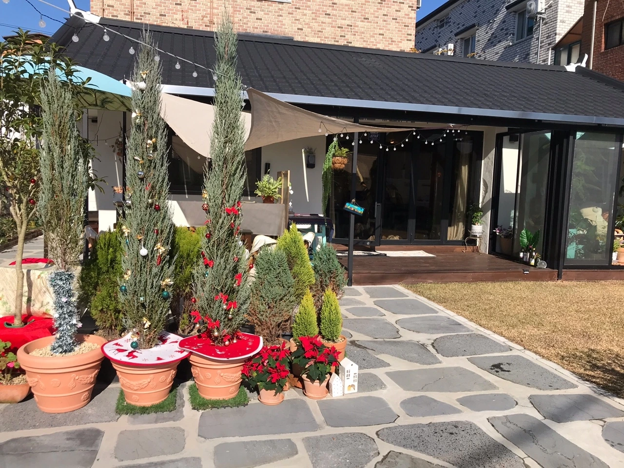 잔디는 색이 초록을 잃어간다. 침엽수 화분들을 옮겨서 공간을 만들었다. 블루 에인절 나무에 겨울맞이 장식을 했다.