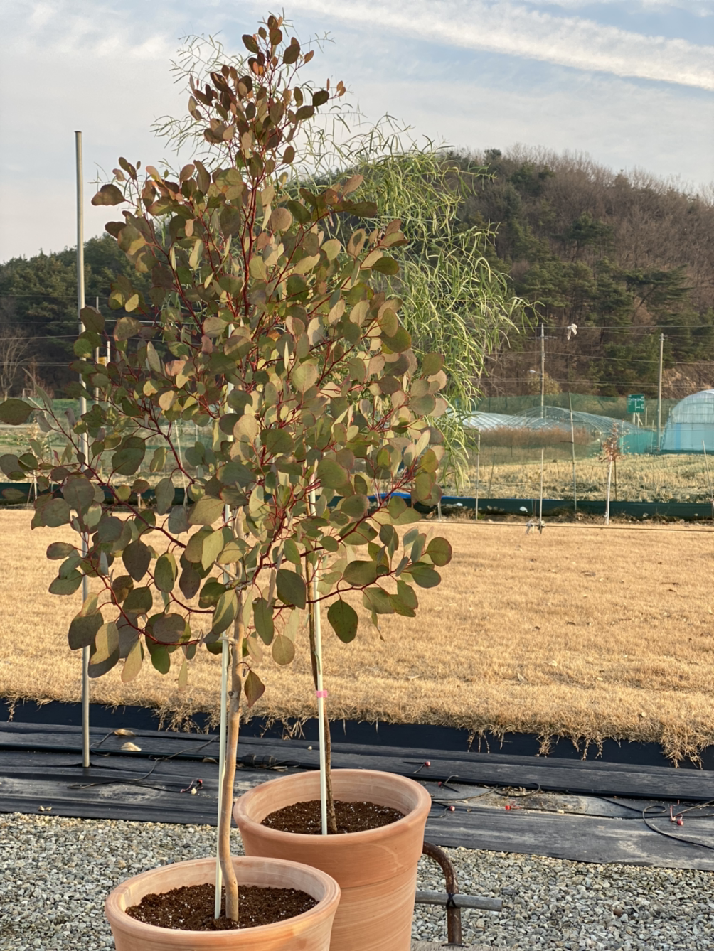 바로 내가 좋아하는 화분 스타일은 이 키 큰 유칼립투스 나무의 화분이다. 이것보다 더 심플하면 좋겠지만 이 정도면 아주 마음에 든다. 화분 가격은 나무 가격과 비교할 때 매우 비싼 편이다. 친구들과 나는 팔랑귀라서 오래되어도 변하지 않는다는 가드너 설명에 구입하게 되었다.