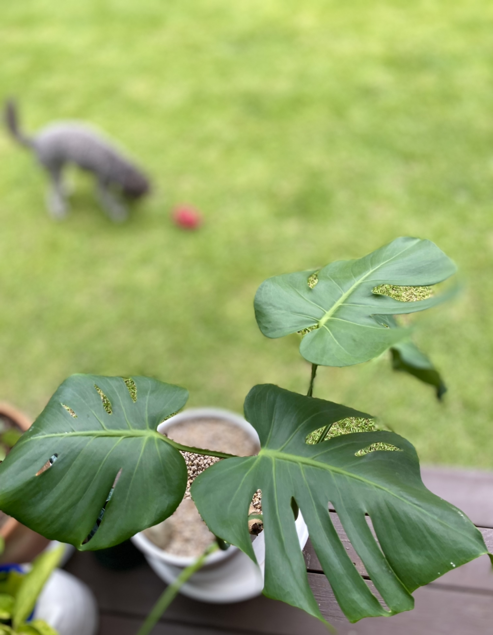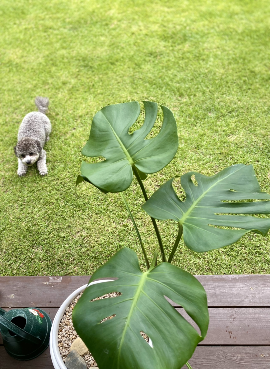 몬스테라의 잎을 들어 하늘을 보고 정원을 보고 강아지를 본다.