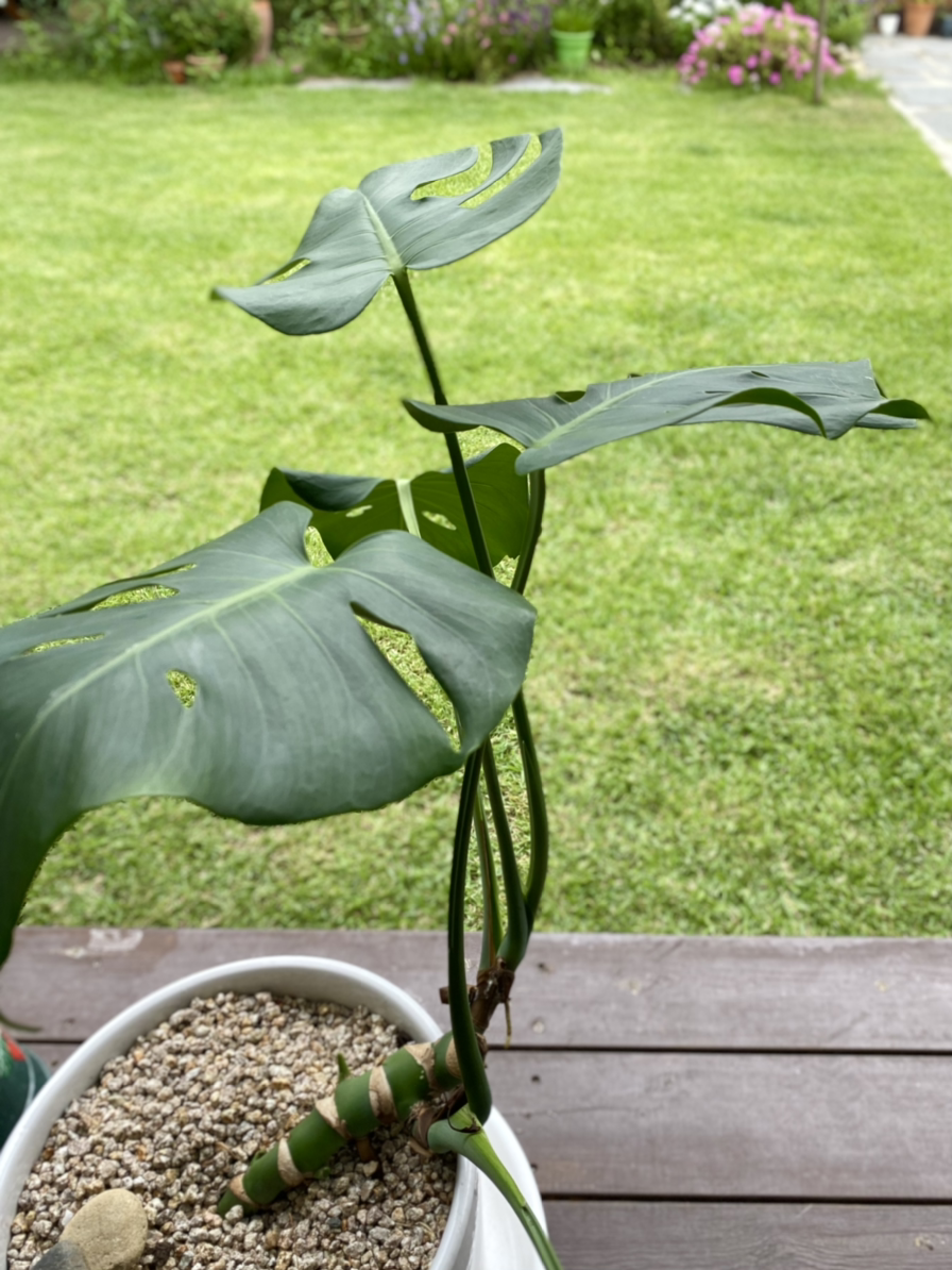 늘 푸르던 몬스테라가 엄동설한에 잎이 얼어 흐느적거렸다. 온실의 귀퉁이에서 외풍에 시달렸던 것 같았다. 다행스럽게 뿌리에 가까운 줄기까지 얼지는 않은 듯했다. 잎을 모두 싹둑 자른 후 안쪽으로 옮겼다. 3월 한 달 동안 실내로 옮겨 햇볕도 없는 곳에 두었다. 물은 거의 주지 않으려고 시선에서 먼 곳에 두었다. 한 달 동안 두 번 정도 물의 양도 조금만 줬다. 한 달 후에 싹이 올라왔다. 4월에 햇볕이 조금 드는 곳으로 옮겼다. 잎이 무럭무럭 나왔다. 겹으로 가지가 나오자 위의 잎에 구멍이 생겼다.