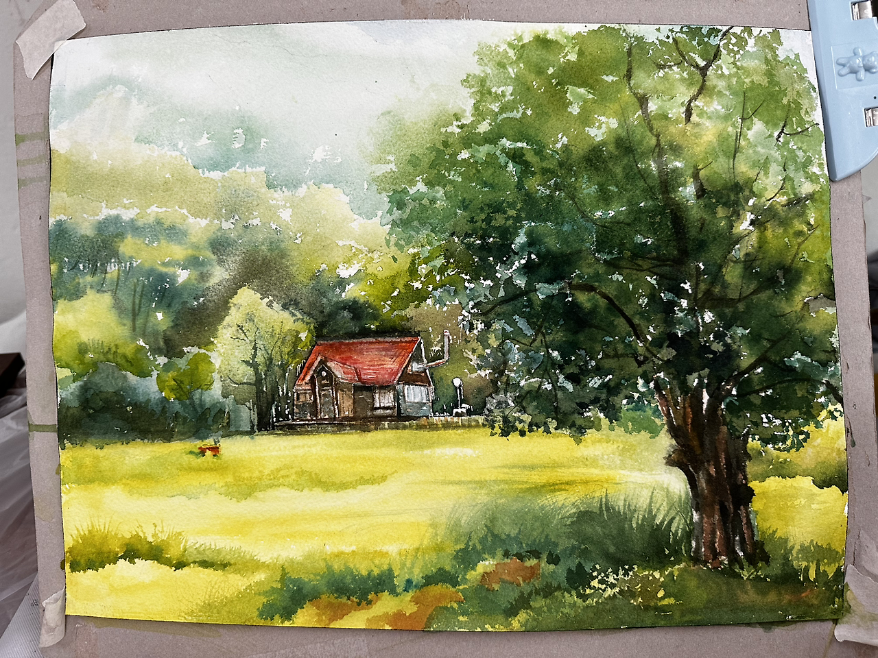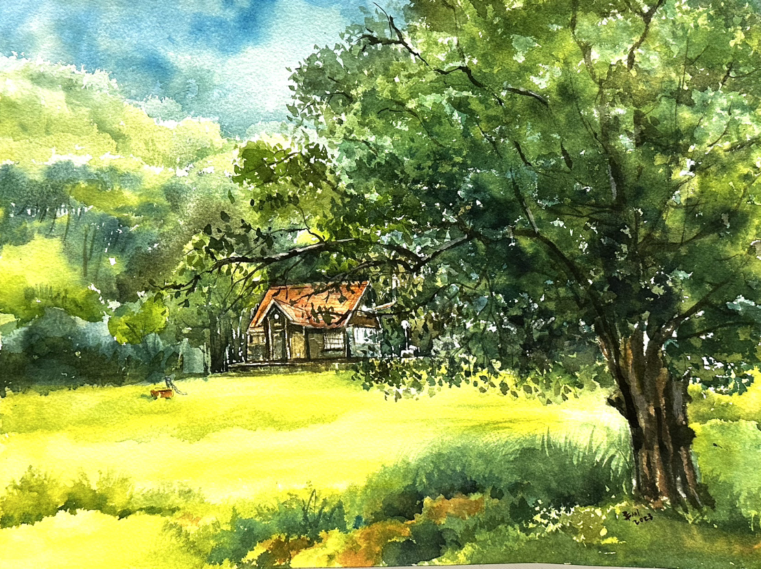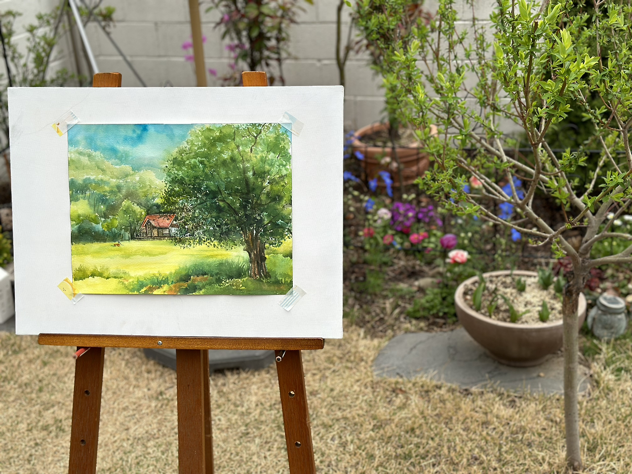 그림을 가르치다 보면 나도 그리고 싶은 의욕이 넘친다. 오후에는 지난해 그리다 만 것을 꺼내 완성했다. 바로 우리 농막 모습이다.