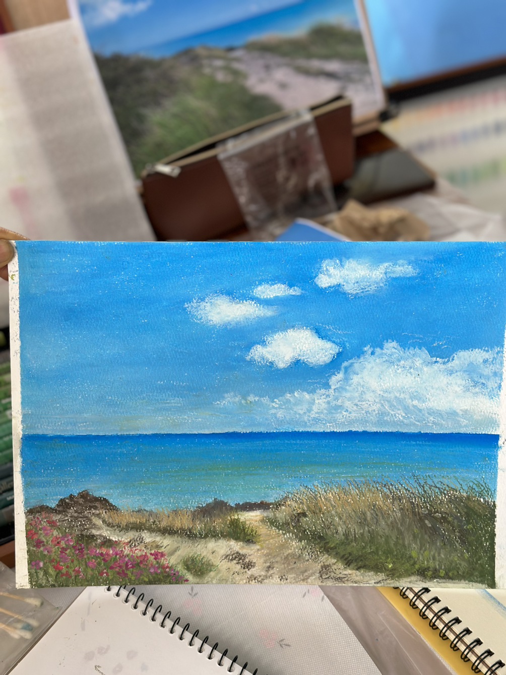오늘 바다 그림을 그렸다. 아래 그림은 바로 그 수강생의 것이다. 나는 아주 조금 조언했다. 예전에 내가 제주도 가서 찍은 어느 바다 모습을 그린 것이다.