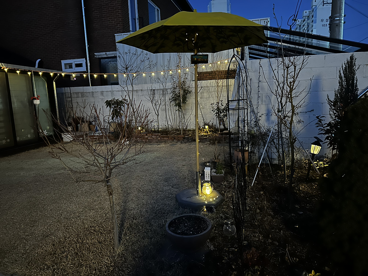 그림을 그리다 보니 정원의 태양광 줄 조명이 반짝인다. 우리 깜뽀는 완전히 삐졌다. 종일 산책을 못 나갔기 때문이다.
