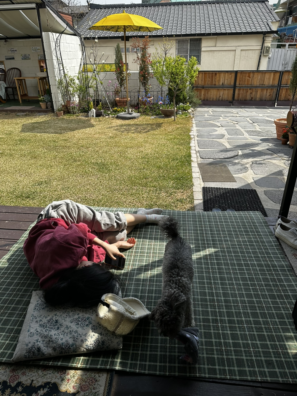 “ 그래, 이참에 햇살 좀 받아라. “ 하고 말했다. 사람이 있건 말건 신경 쓰지 않고 나도 함께 누웠다. 다행스럽게도 오늘은 지나는 사람들이 거의 없었다.