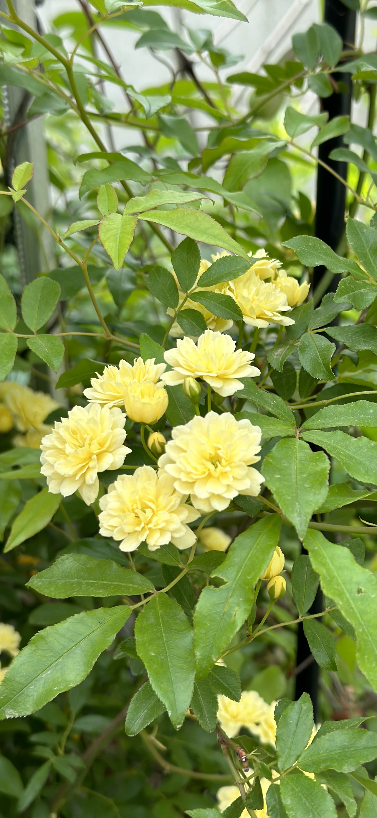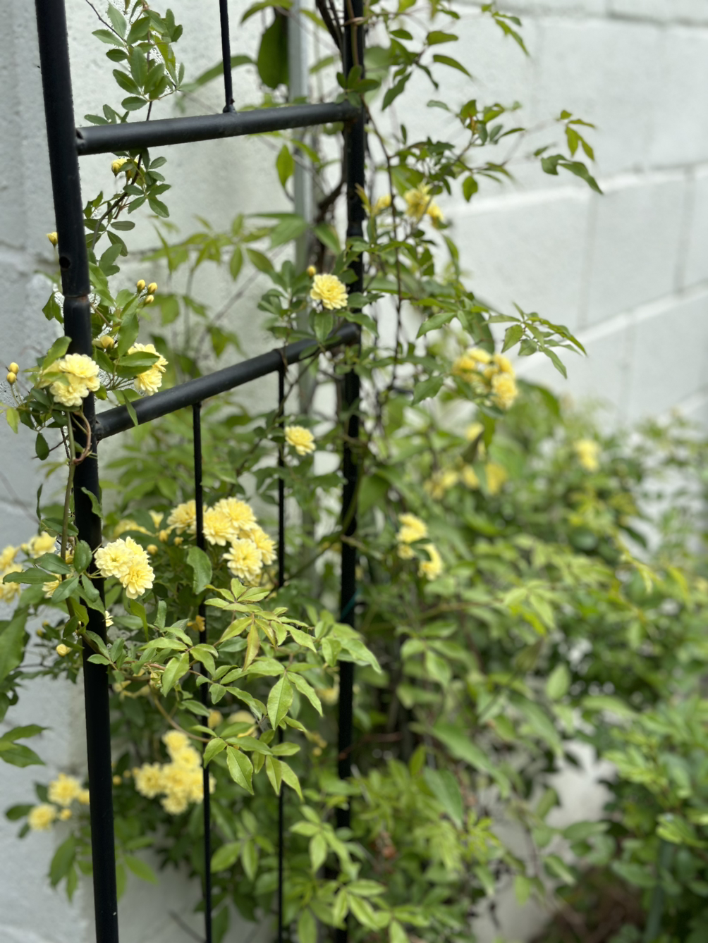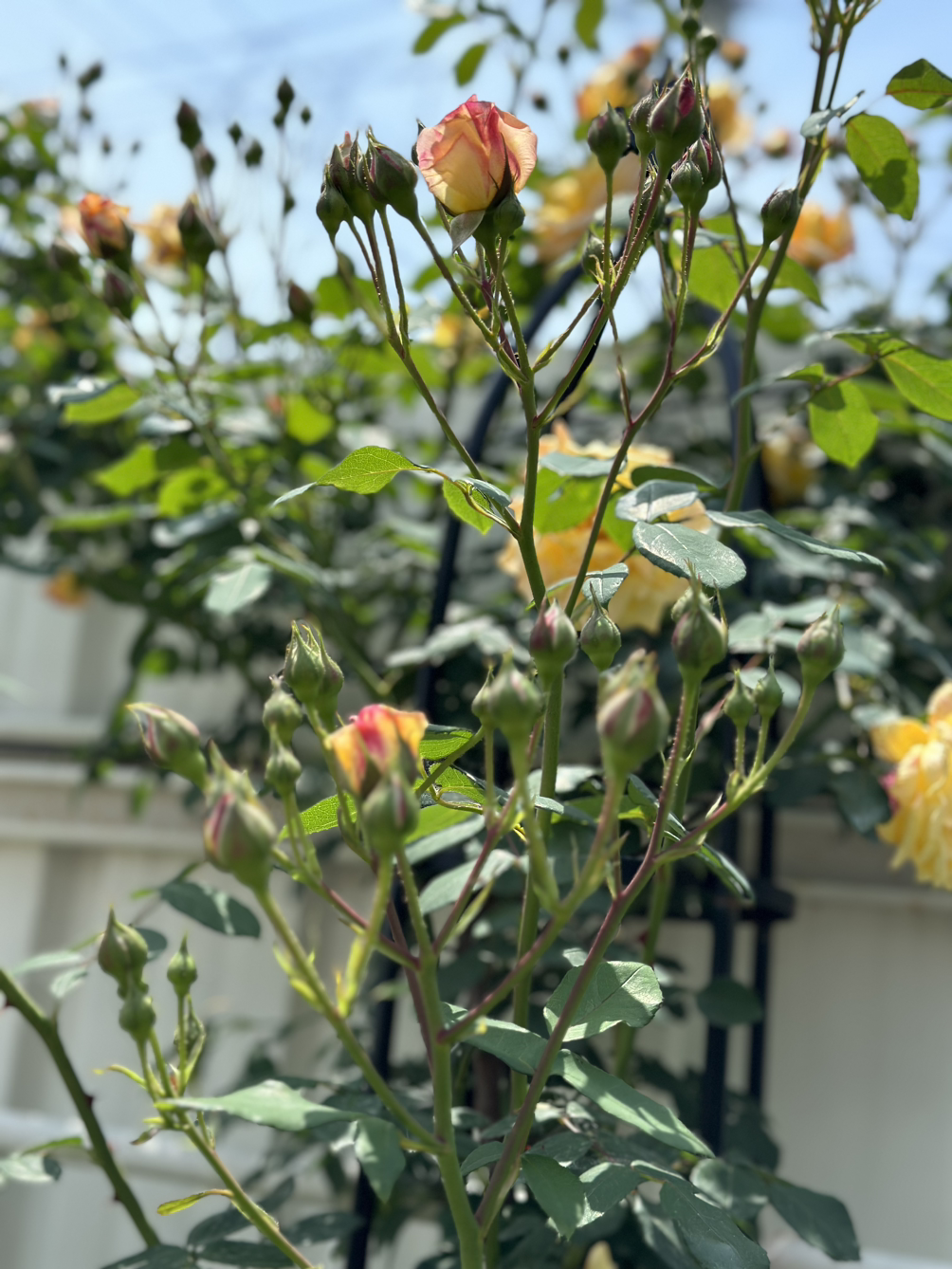 올해는 유난히 장미들이 만발했다. 이제 뿌리를 잘 내렸나 보다. 이들 중, 가시 없는 장미가 있다. 연노랑 목향장미다. 썬룸을 타고 올라가게 할 요량이다.