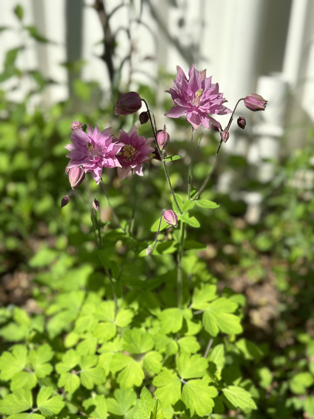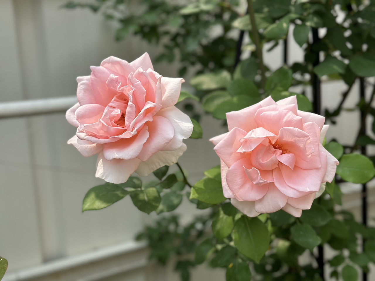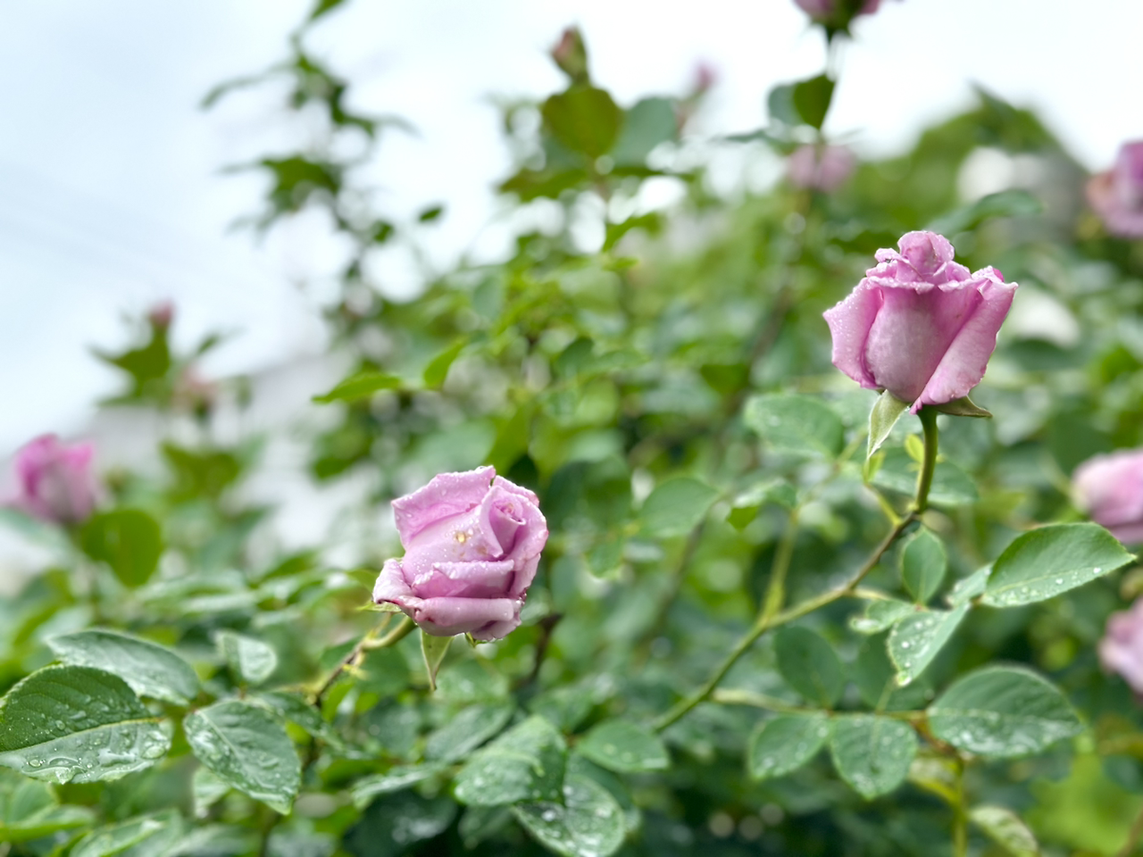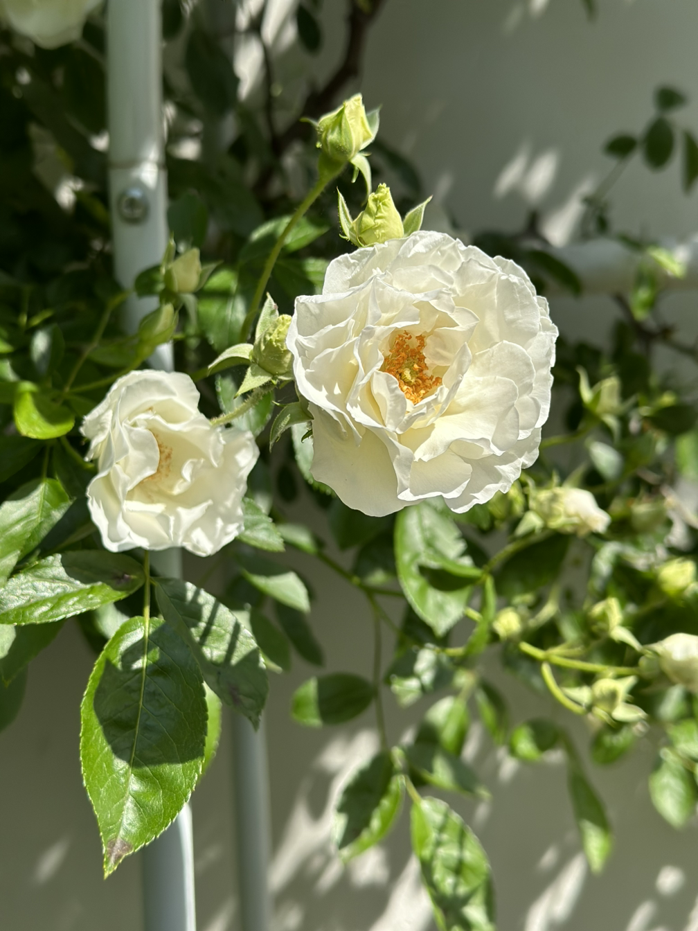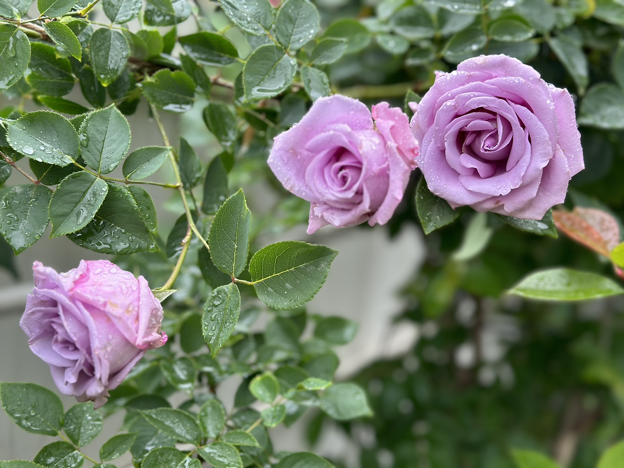 벌벌 떨면서 사다리를 타고 올라가 장미 가지를 지주대에 묶었다. 보랏빛 장미들이 잘 타고 올라가기를 바란다.