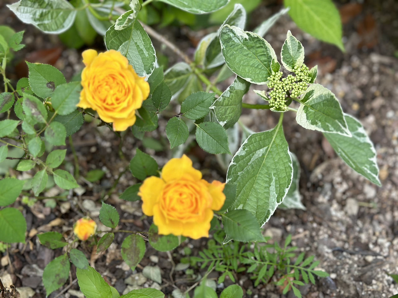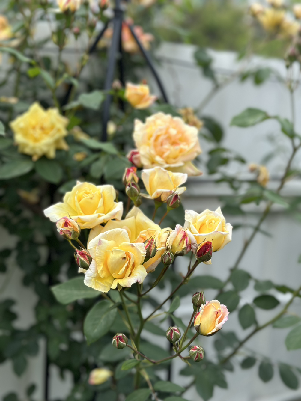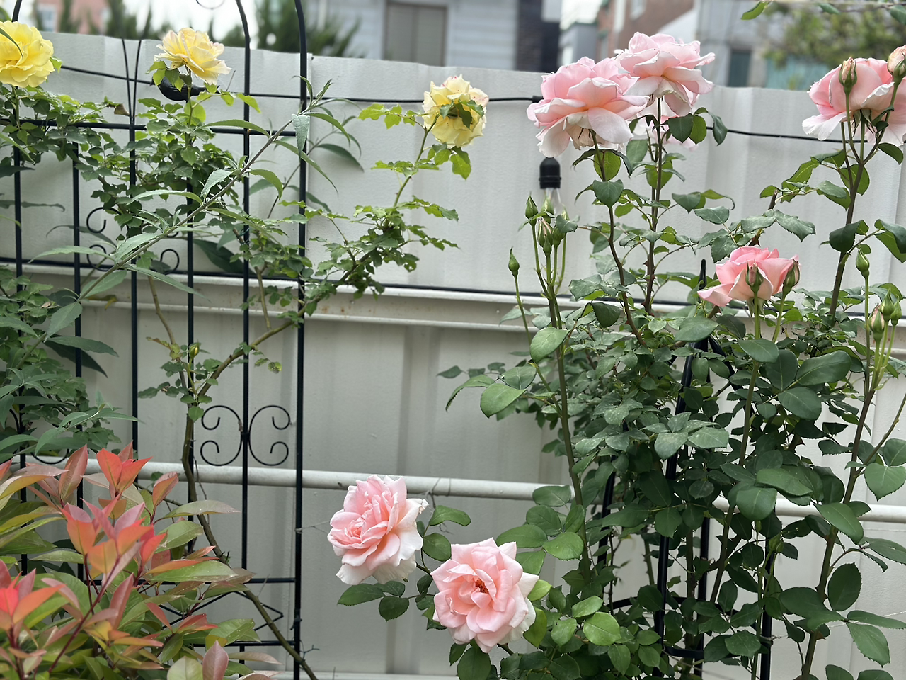 서로 종류가 다른 노란 장미들과 이름도 우아한 섬머레이디(Summer lady) 분홍장미가 아주 풍성하게 피었다. 섬머레이디는 곧게 자라는 편이다.