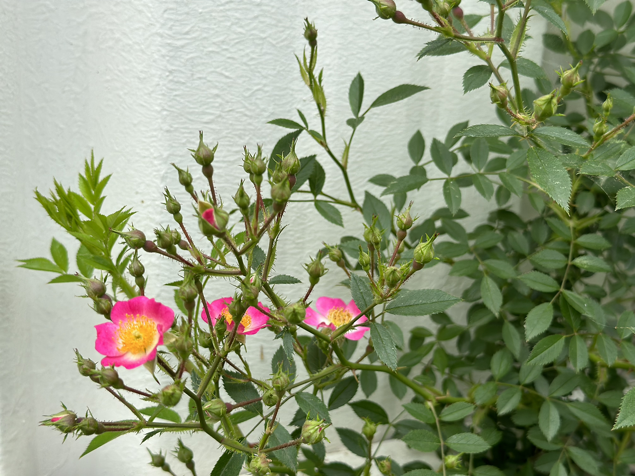 보라색 장미에 간단한 지주대를 세웠는데 올해 늘어져서 주 가지에 끈을 길게 묶어 고정했다. 그런데 갈수록 뒤죽 박죽 되어 장미 가지 아래의 배롱나무가 안쓰럽다.