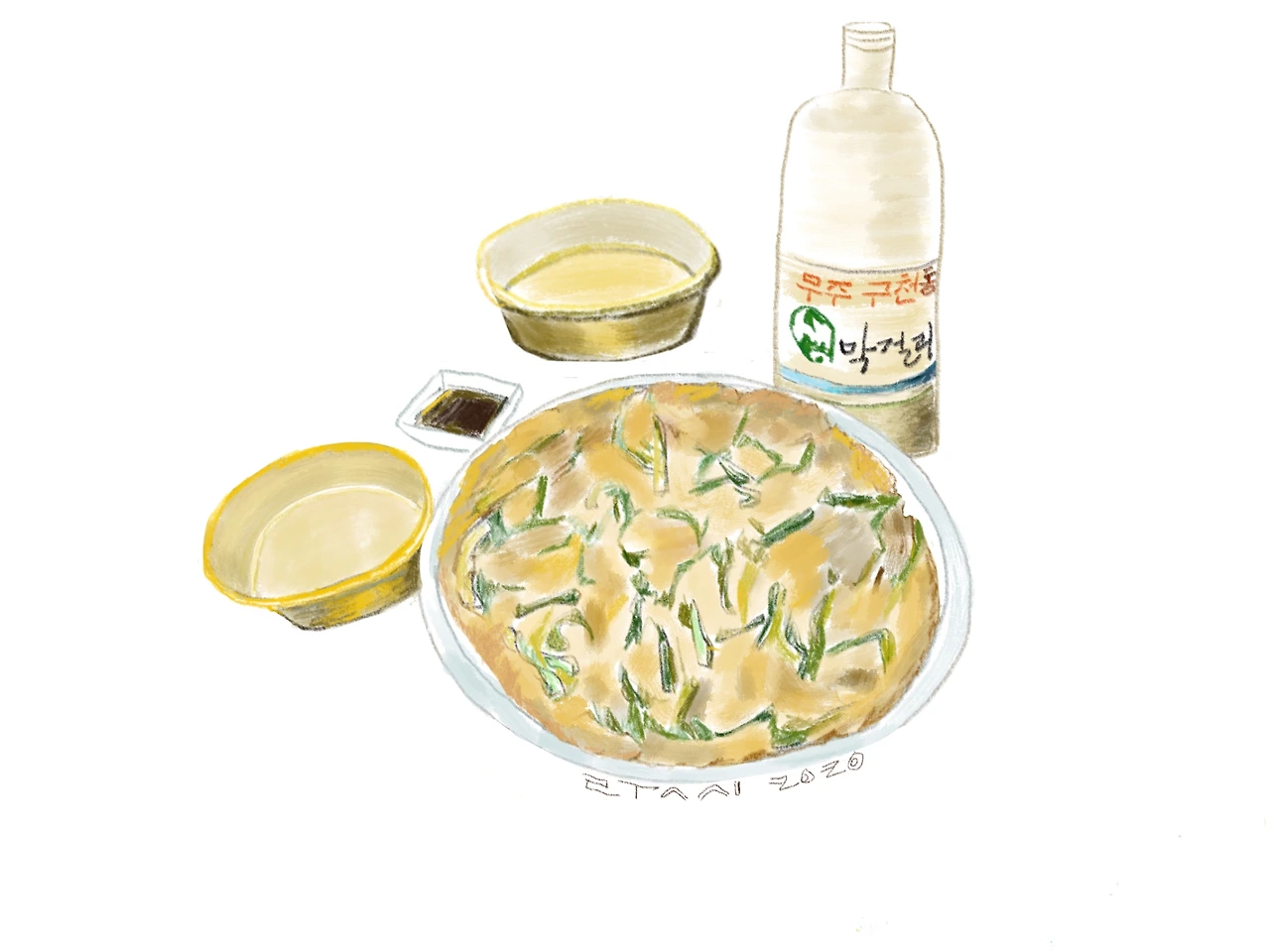 오를 때는 산길로, 내려올 때는 너른 길로, 발길을 옮긴다. 산아래에 가까워지니 김밥 한 줄 먹은 뱃속에서 꼬르륵 소리가 난다. 마침, 산 밑에 동동주와 파전이 보인다. 아니 들를 수 없다. 야외 테이블에 앉아 멀찌기 떨어져서 구천동 막걸리와 파전을 주문한다.