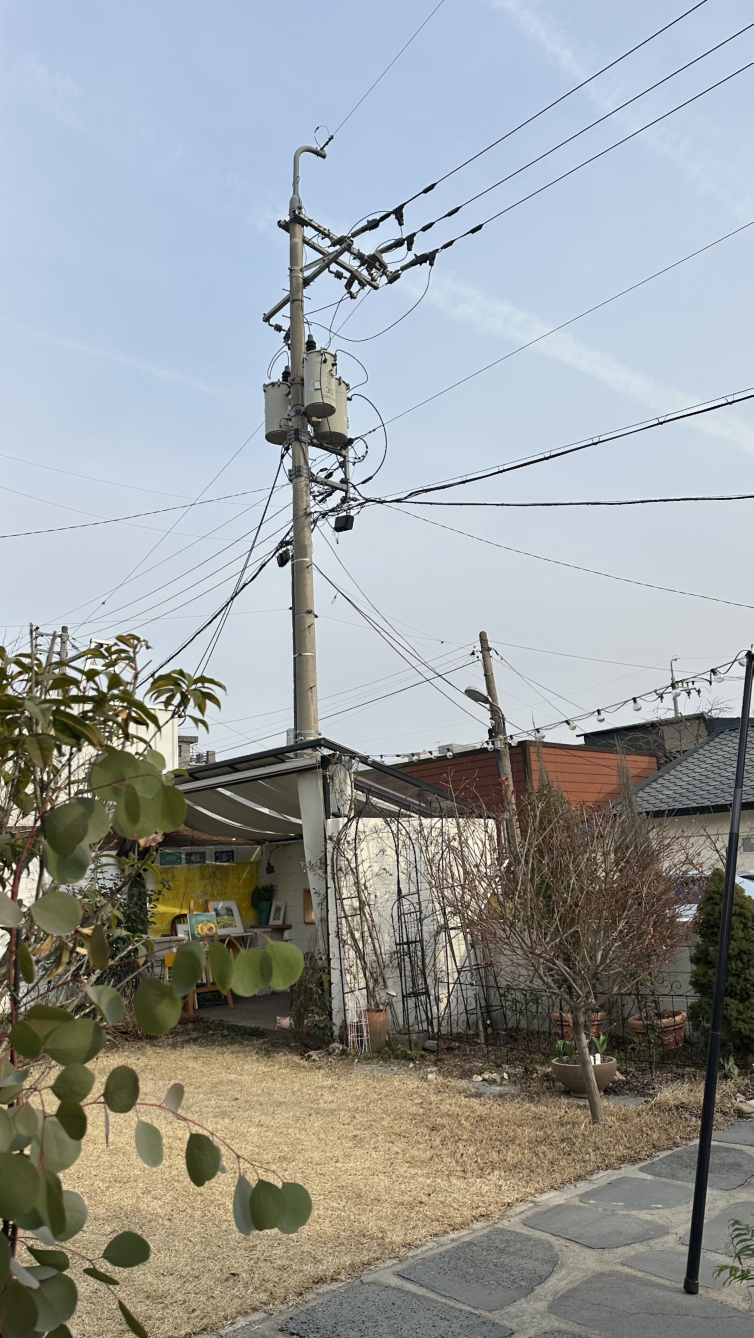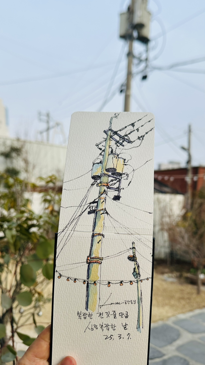 도심 속 언덕배기 전봇대는 가로등을 달고 밤 작업에 지친 이들에게 따뜻함을 건넨다. 저녁해가 걸린 전봇대는 애수가 느껴진다. 한여름날엔 짙은 그림자를 만들며 위풍당당하다. 새 도심은 전봇대가 없다. 언젠가는 땅 밑으로 모두 사라질 테지. 그땐 ‘라테전봇대’가 될지 모르겠다.‘나 때는 말이야 전봇대가……‘