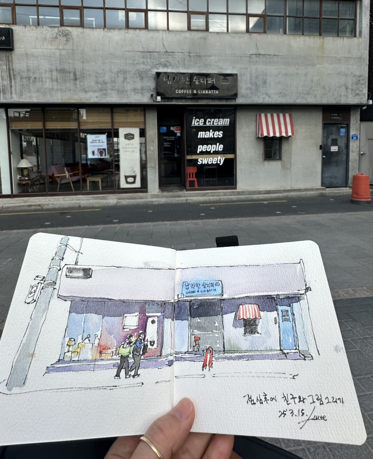 점심때 삼백집 콩나물국밥을 주로 먹는데 바로 옆집 카페의 작은 어닝이 눈에 들어온다. 예쁘면 그리고 싶다.