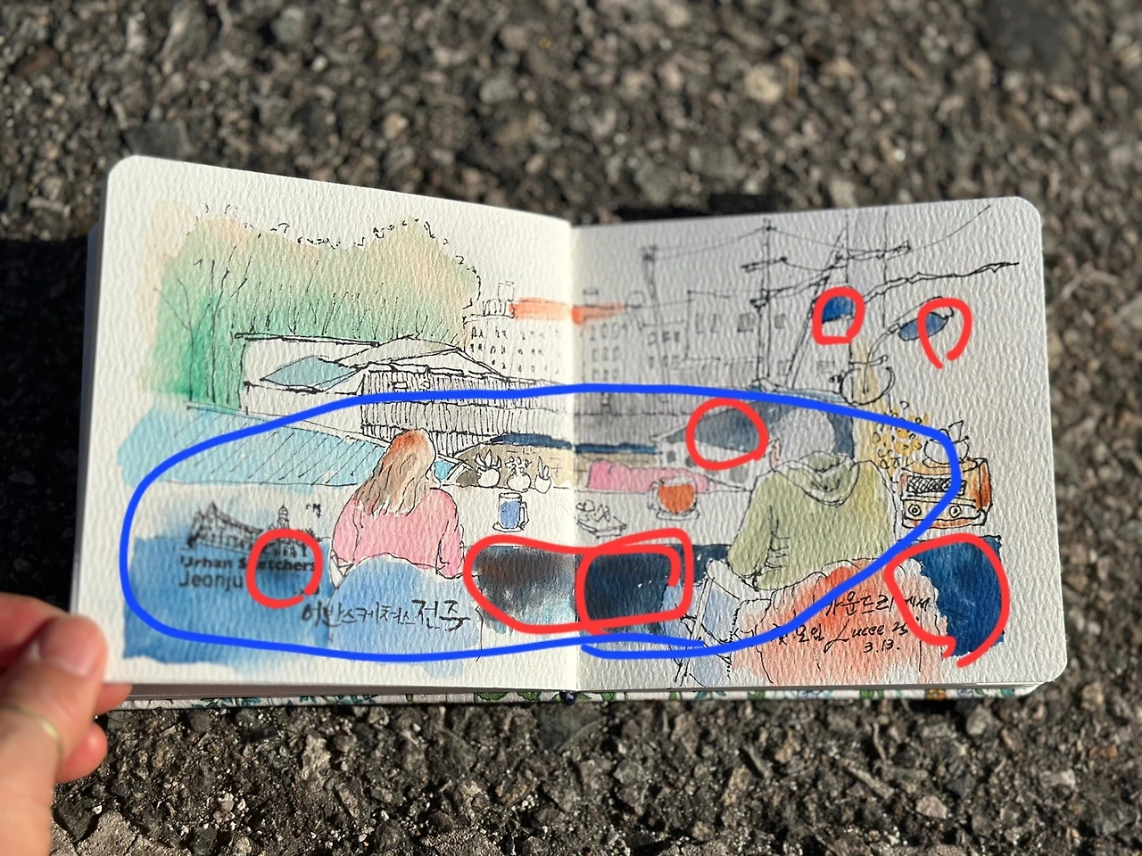 스케치는 20분 정도 걸렸다. 색칠하는데 너무 시간에 쫓겨서 너무 진하게 된 부분과 미처 칠하지 못한 부분까지 난리다.