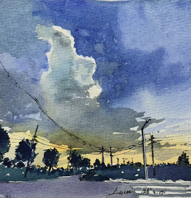 가끔 신호등에서 차가 멈출 때면 얼른 뒤를 찍어 보기도 한다. 나는 퇴근을 서쪽으로 하면 좋겠다는 생각이 들곤 한다. 아쉬움 담아 그림으로 표현해 본다.