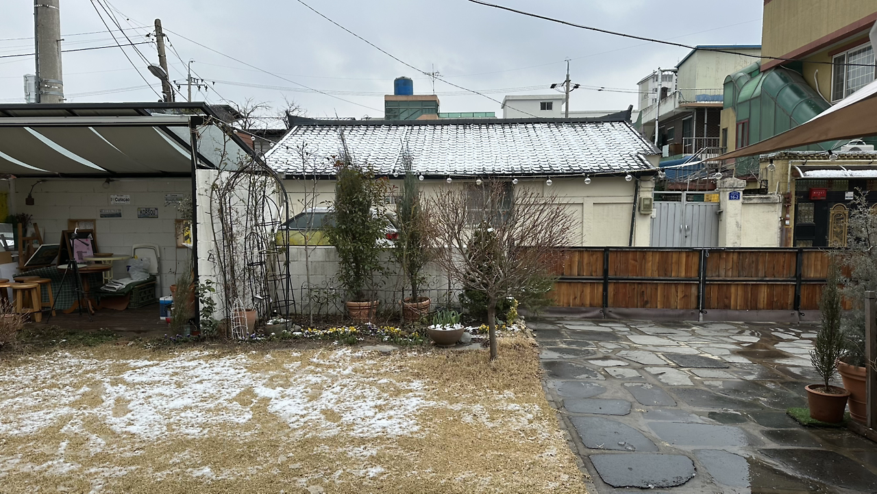엊그제 대문 사포질을 4시간 하고 1시간 동안 스테인으로 마무리하길 잘했다. 바로 다음날부터 비 오고 눈 내리고 난리다.