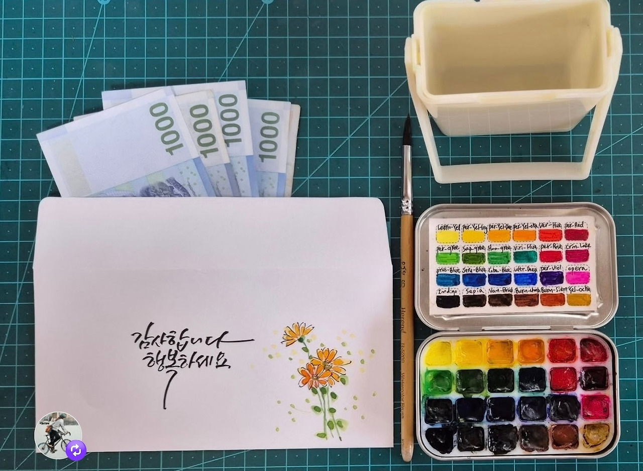 물감 꺼내 꽃송이를 그리고 손수 캘리로 ‘감사합니다. 행복하세요. ’ 글자를 남겨 돈 봉투를 만들었다.
