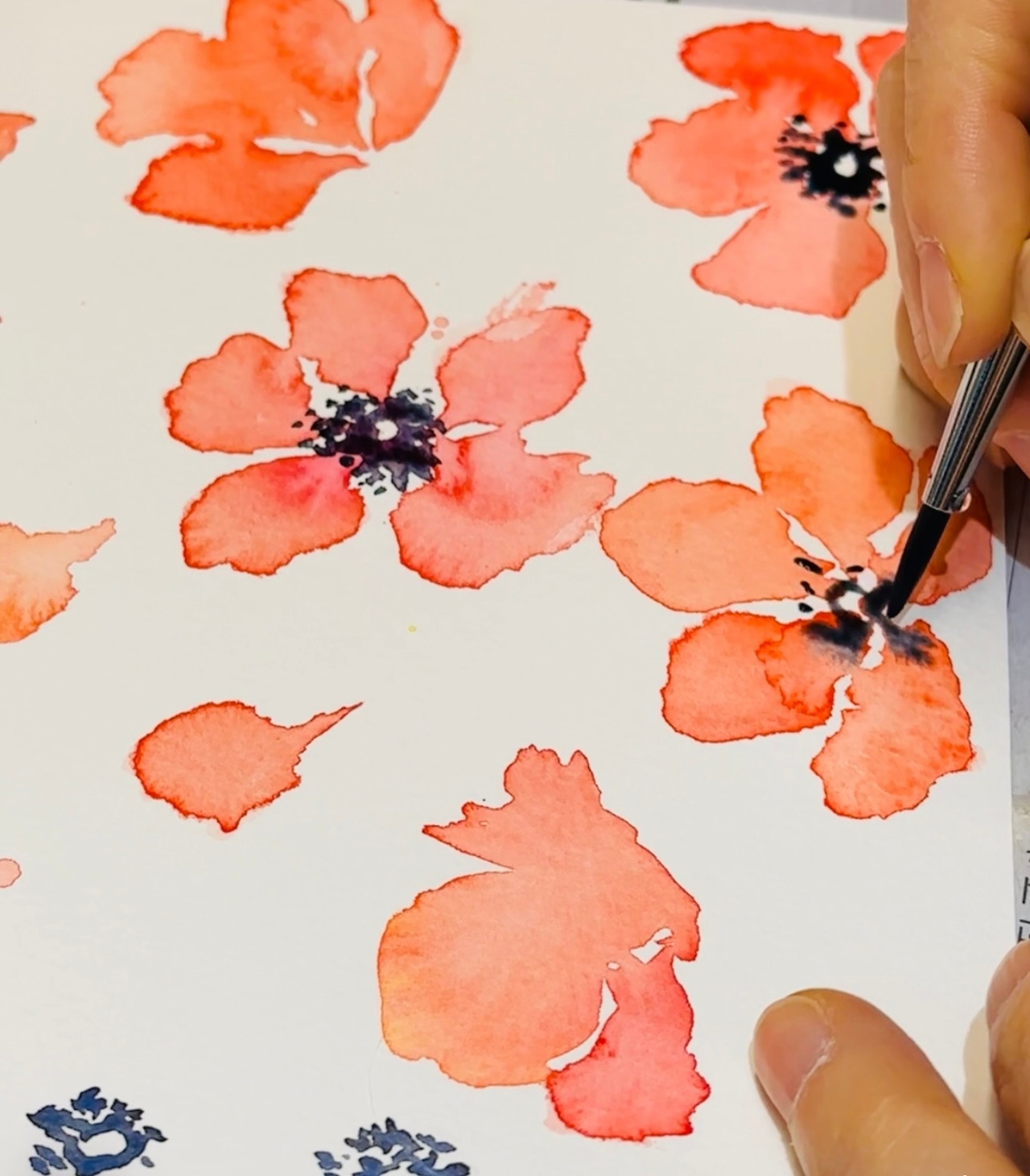 먼저 가장자리 점들 일부를 불규칙하게 찍은 후 가운데 동그라미를 그려주고 점에서 원을 향해 쓸어내리기. 전체적으로 일정하지 않은 점들 찍어주기. 이때도 물의 양이 적당히 있어야 예쁘다.