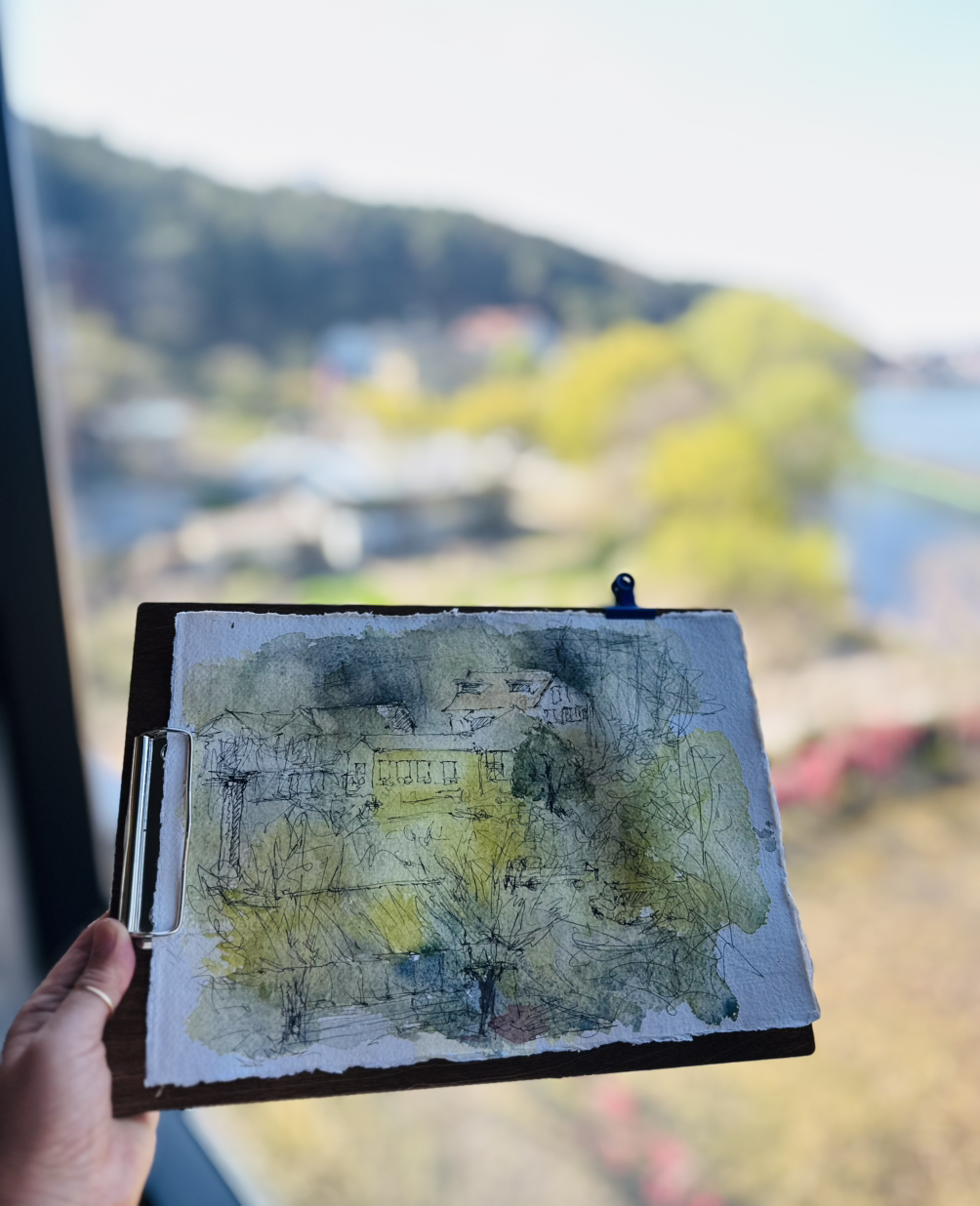 꽃만큼 사랑스러운 것이 연둣빛 나뭇잎 새싹이다. 카페 창밖 풍경이 아름답고 그림 주제로 삼을 것들이 많아 우리들 모두가 흥분했다.