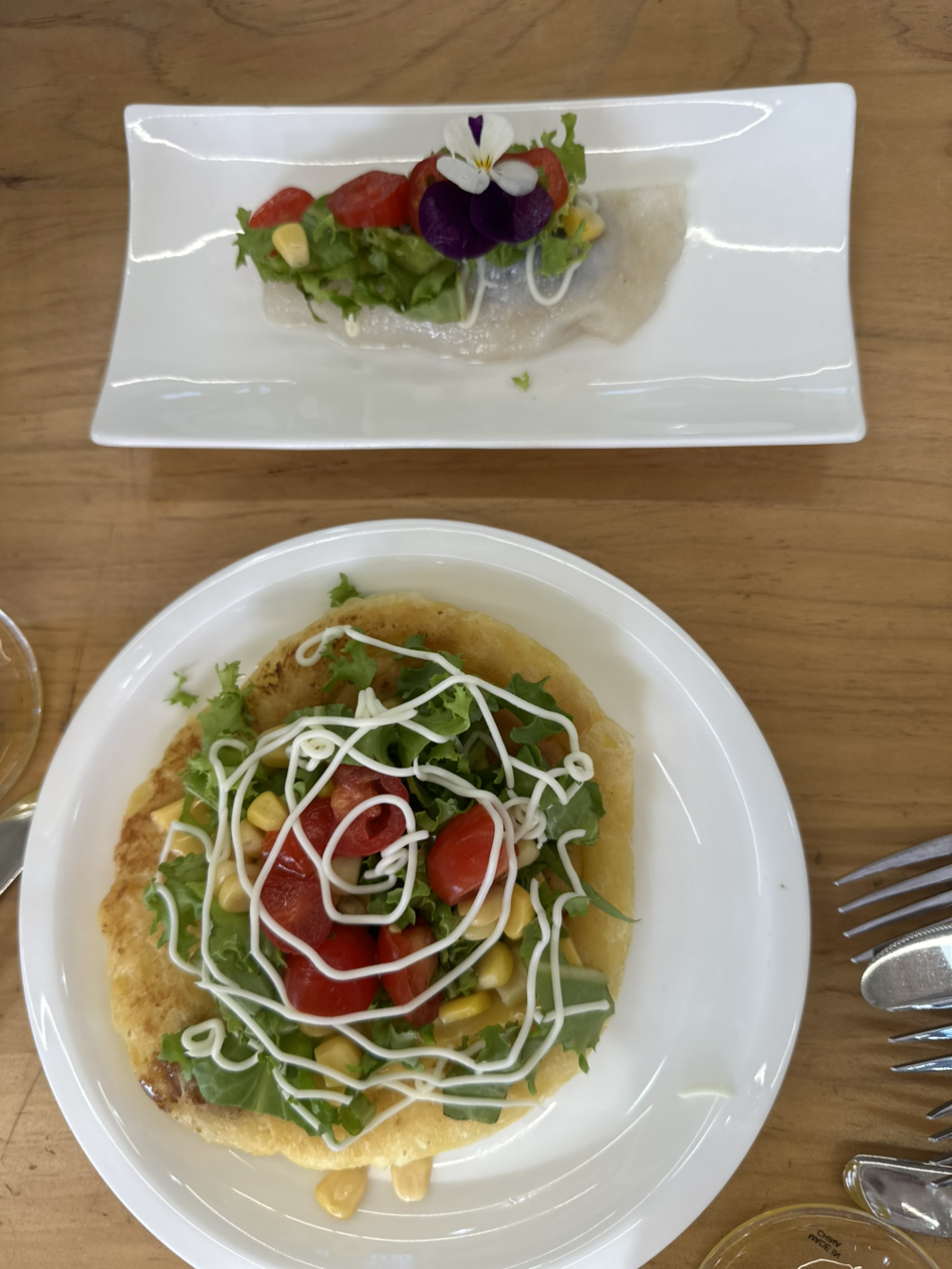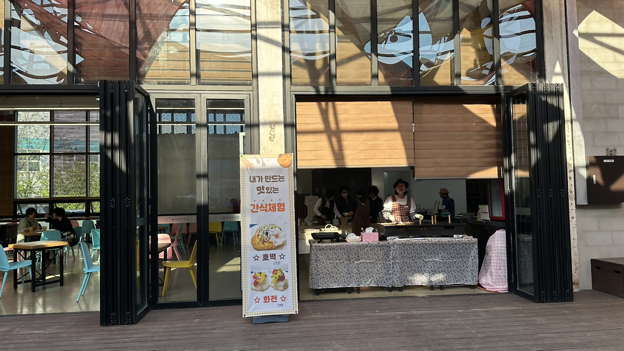 돌아다니다가 지인이 하는 팝업 스토어를 만났다. 바로 ‘공간모닝 표’ 정원의 꽃이 장식된 부꾸미 화전도 하나 주문했다. 화려한 옷을 입은 호떡도 주문했다. 각 5천 원이다. 음료는 지인이라고 서비스로 주셨다.