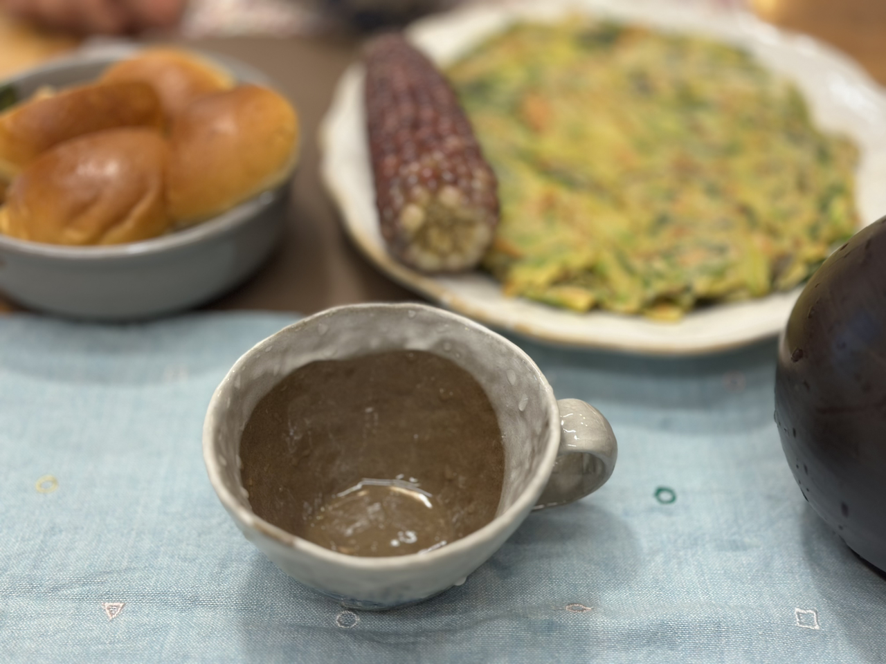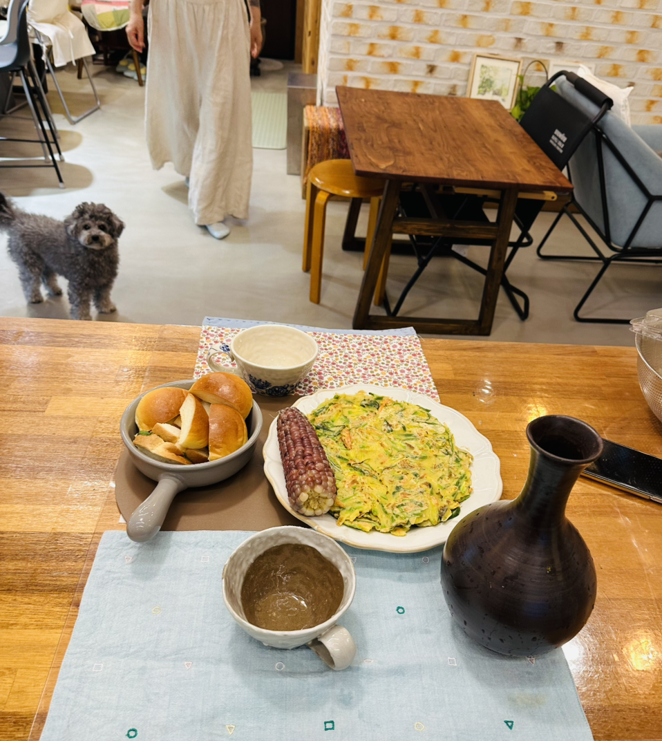 진북동 책방 이웃께서 무려 세 장의 야채 전과 방금 쪄서 따끈한 옥수수를 가져오셨다. 찐 옥수수와 전이 나에게는 막걸리 안주로 보였다. 마침 비가 내렸고 마침, 전이 있으며 함께할 이웃이 있으니 막걸리를 마시지 않을 수 없다.