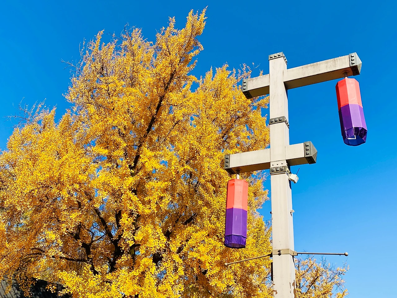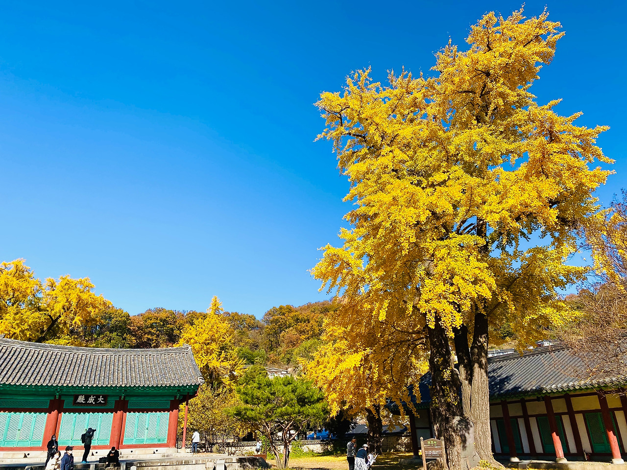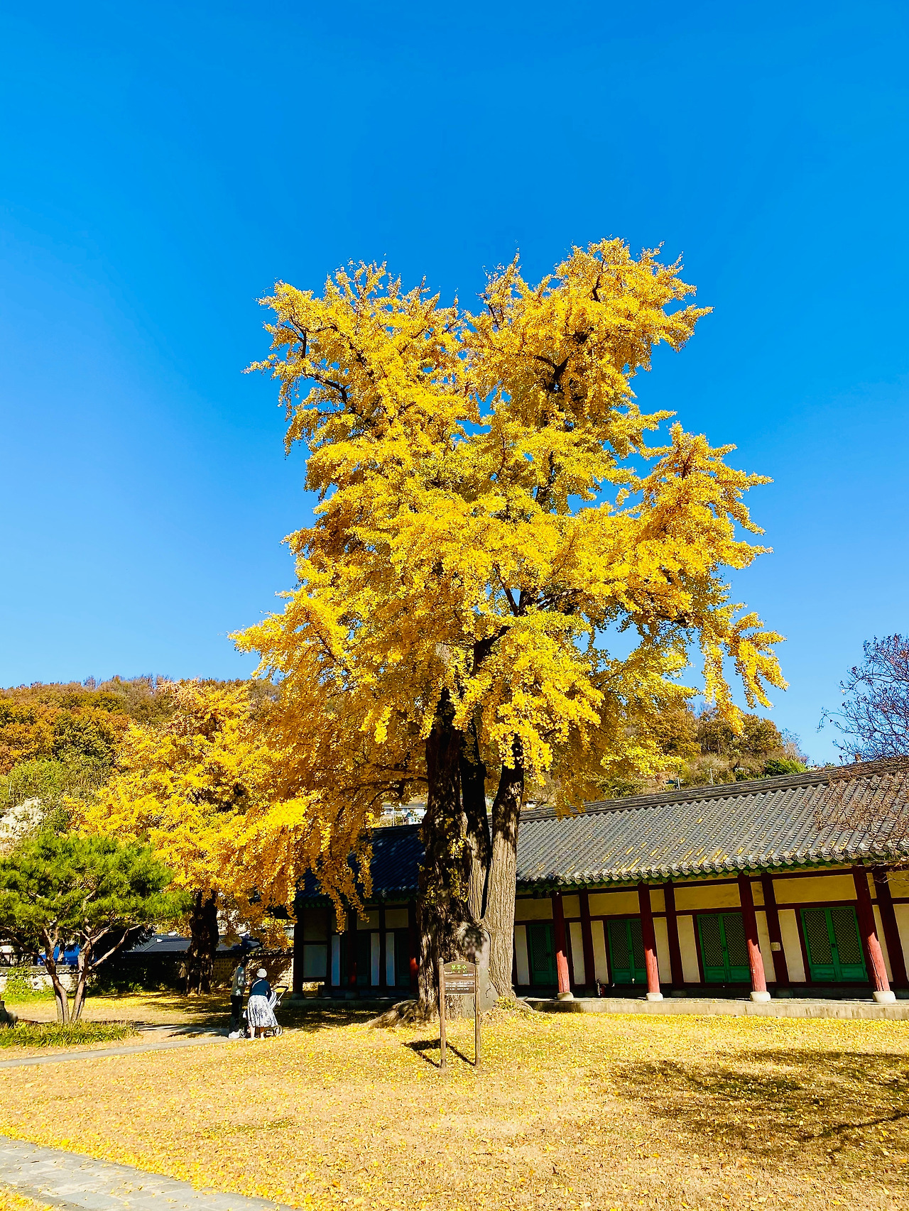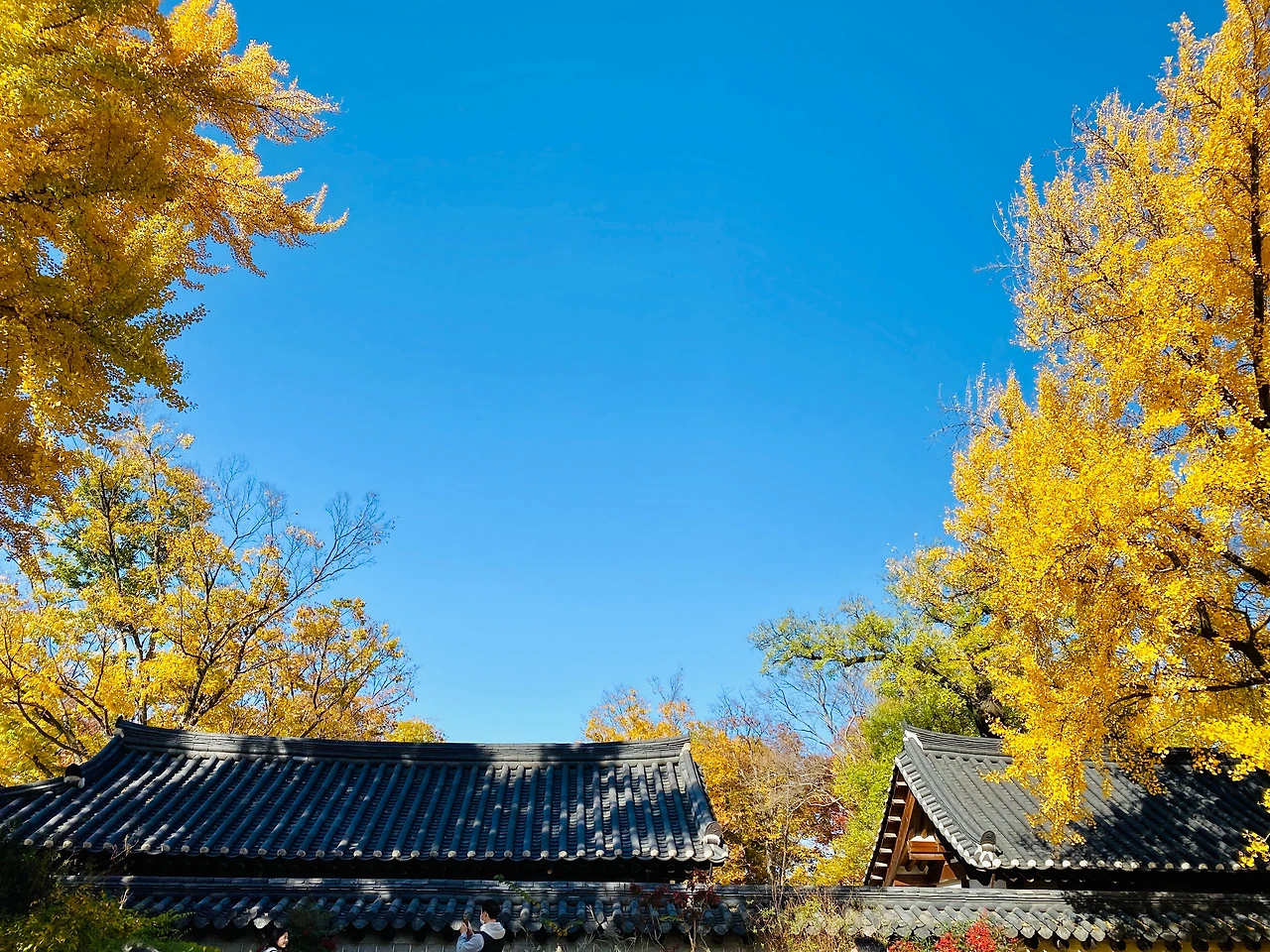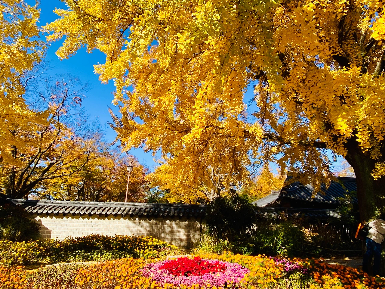 한옥마을의 경기전 역시 무조건 들려야 하는 곳이다. 경기전 정문의 돌담길을 따라 화려한 꽃밭을 가꿔 놓았지만 눈은 자꾸 고개를 들어 하늘을 보게 된다. 은행잎들이 나 보란 듯이 하늘을 향해 쭉쭉 뻗어 있기 때문이다.