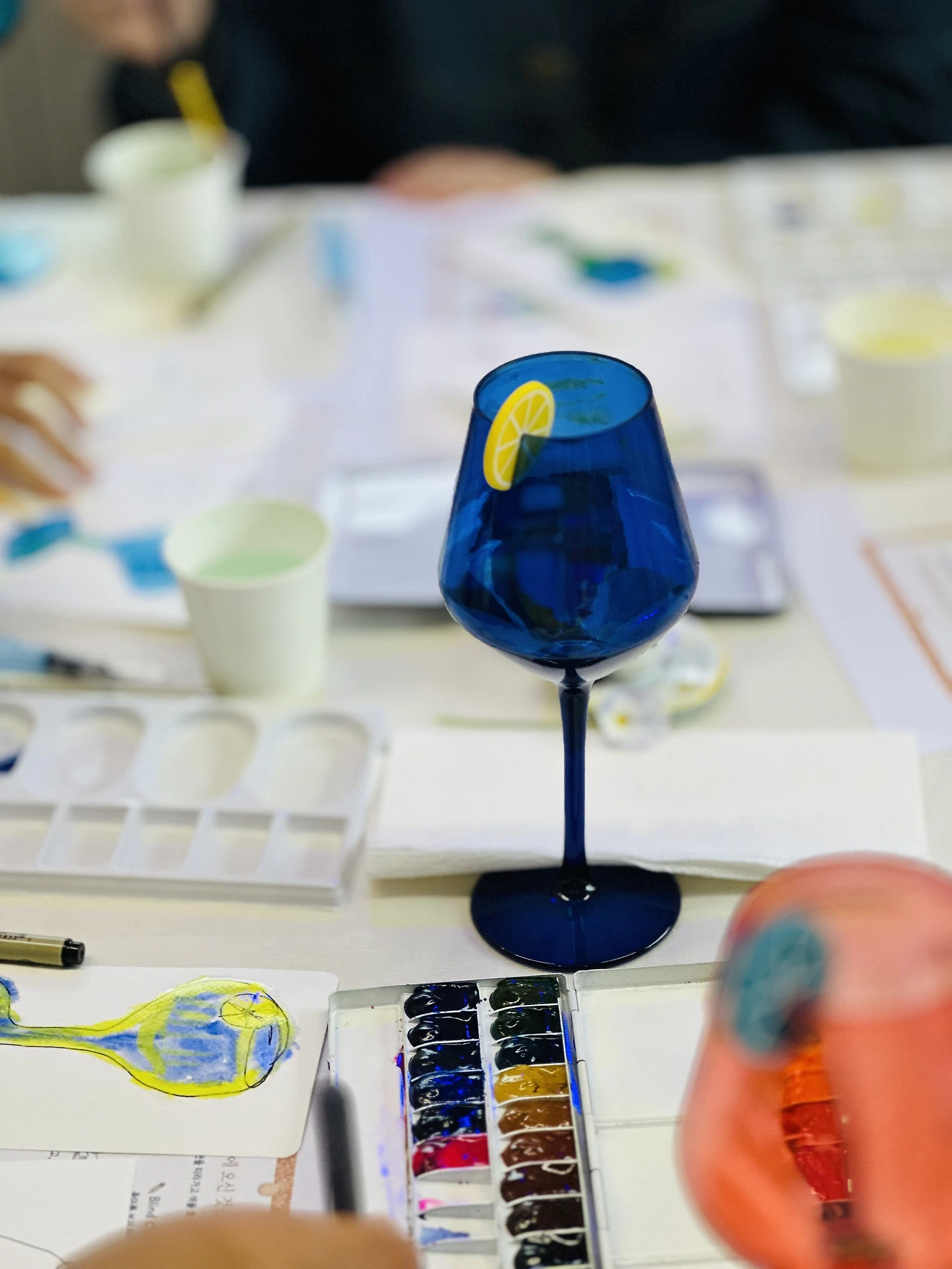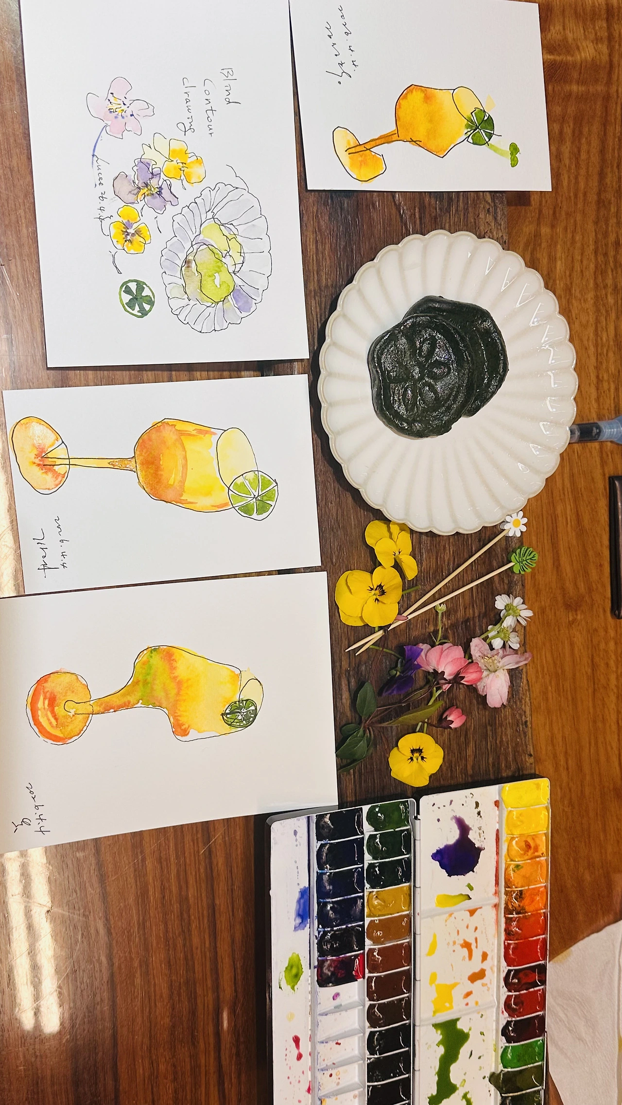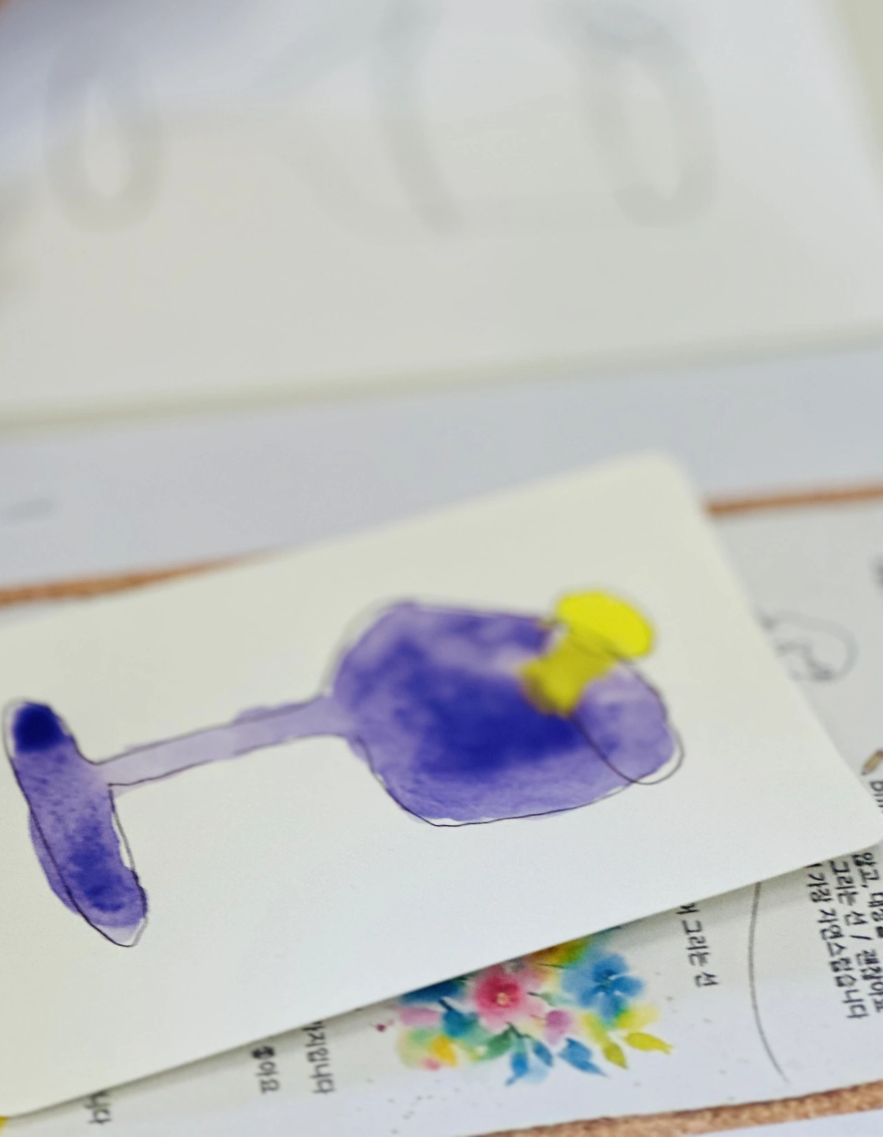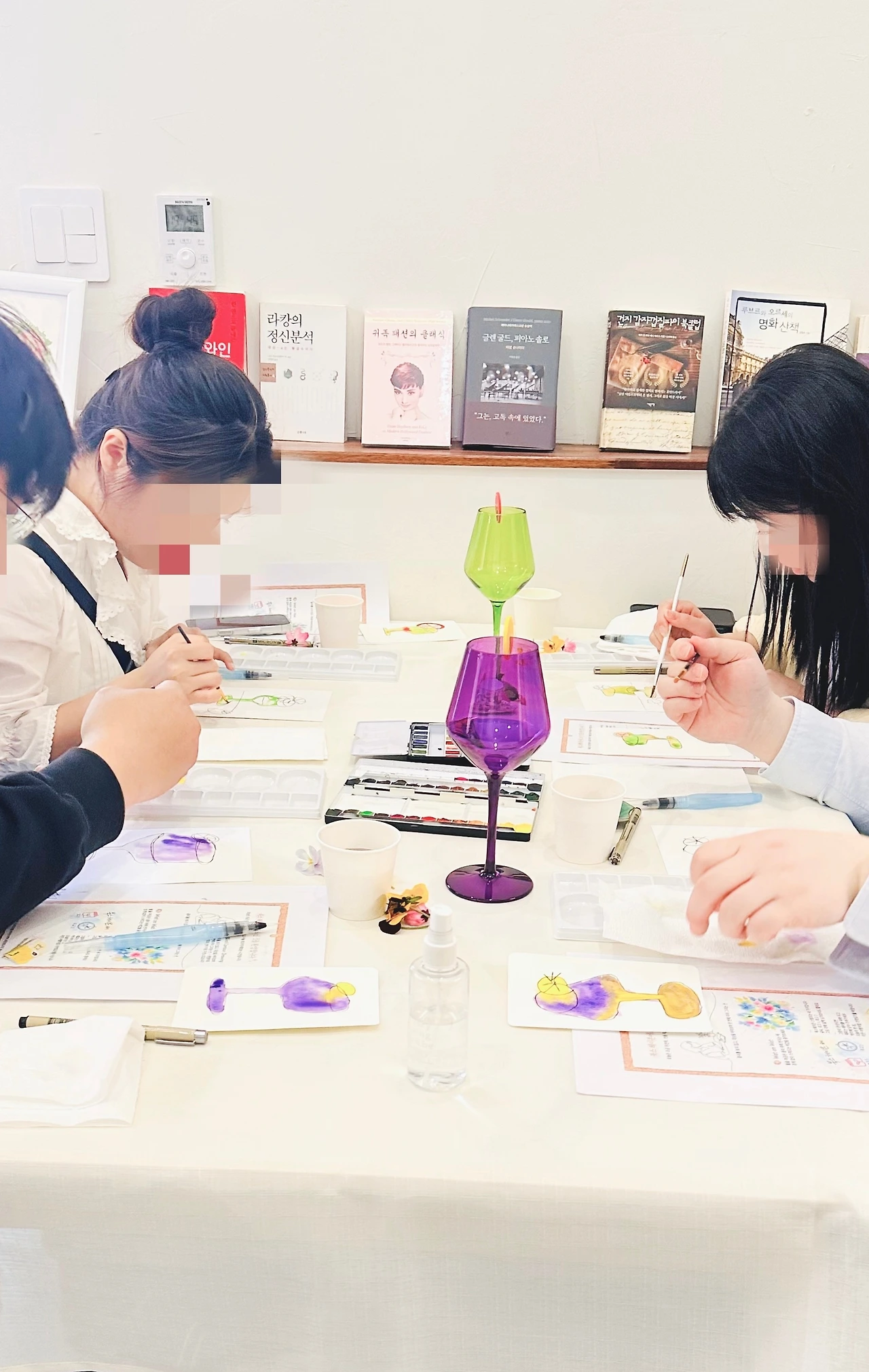 책방에서 그림 체험은 블라인드 컨투어 드로잉과 웻온웻(wet on wet) 기법을 가볍게 했다. 모두들 진지하셨다.