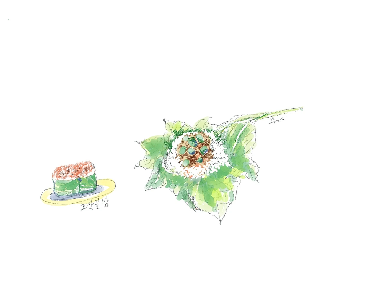 "아! 그거요. 큼직큼직하게 썰어서 호박잎이랑 된장국 해 먹어도 맛있고, 꽃게탕을 해도 맛있고, 어떤 찜이나 찌개에 넣어도 잘 어울려요. 짜장밥 해 먹어도 잘 어울려요. 그리고 호박잎 쌈이 맛있는 계절이네요. 호박잎은 줄기째 길게 뜯어서 줄기의 껍질을 훌훌 벗겨서 찌고, 청양고추 서너 개를 숭숭 썰어 강된장 두 수저와 물 조금 넣어 아주 약불에 살짝 끓여요. 고기 종류가 있으면 같이 쌈 싸 먹어도 맛있고 그냥 호박잎에 밥과 된장 찜만 있어도 담백한 맛이 있어요.”