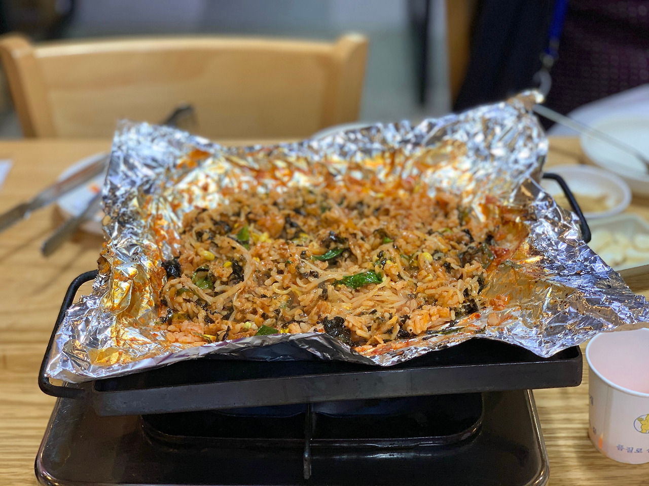 나는 이렇게 포일에 깔린 밥은 별로다. 맛은 있지만 불안하다. 포일 껍질이 목구멍에 들어갈 것 같아서다. 그래서 살살 떠먹었다.