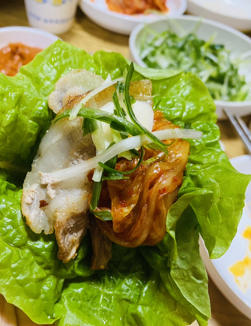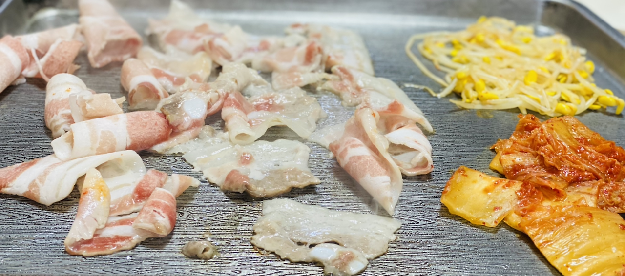 사진과 영상을 보고 시내의 가볍게 먹는 음식점에 들렸다. 대패삼겹살과 불판 볶음이다. 삼겹보다 묵은 김치 볶음이 정말 맛있었다. 지글지글 소리가 요란하게 고프지도 않은 뱃속을 부추긴다.