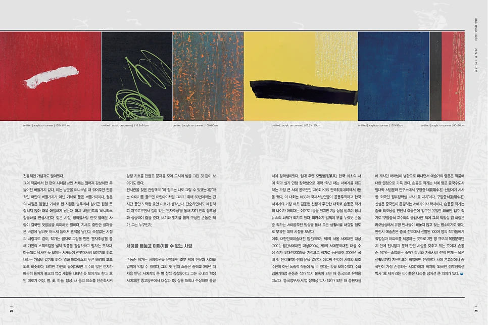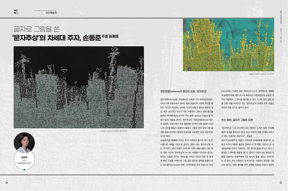 손동준(不涯 孫東俊)은 한국 서예계의 동시대 리더 중 한 사람으로 서예를 기반으로 글자가 그림이 되는 ‘문자추상’을 하는 작가이다. 앞서 언급한 우리나라 1세대 예술가들과 다른 점은 회화 기반의 ‘문자추상’이 아니라 ‘서예’를 기반으로 한다는 점이다. 손동준은 캔버스 가득 색으로 채운 후 엄격한 화면 구성을 거부한 채 ‘그림 같은 글자’로 얼룩을 만들어 낸다. 타시즘(Tachisme)은 '얼룩', '자국'이라는 뜻의 프랑스어 '타슈(Tache)'에서 유래한 말로 1950년대 초, 전 세계적으로 유행한 추상표현주의에 대한 조소적 표현으로 사용되었는데 손동준 작가의 작품에서 그 형식을 찾아볼 수 있다. 누구도 걷지 않은 길을 오랜 세월 이어오고 있는 ‘문자추상’의 차세대 주자 손동준 작가의 작품 안으로 들어가 보자.