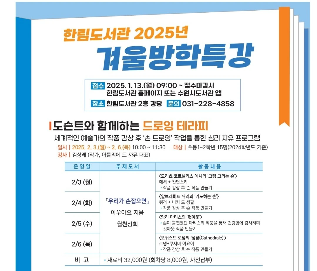 #한림도서관 #2025겨울방학특강 #도슨트와함께하는드로잉테라피 #드로잉테라피 #도서관 #작가특강 #4월작가특강 #김상래 #아틀리에드까뮤 #도서관강의 #도서관어린이프로그램 #심리치유 #미술치유 #미술테라피 #미술교육 #수원시도서관