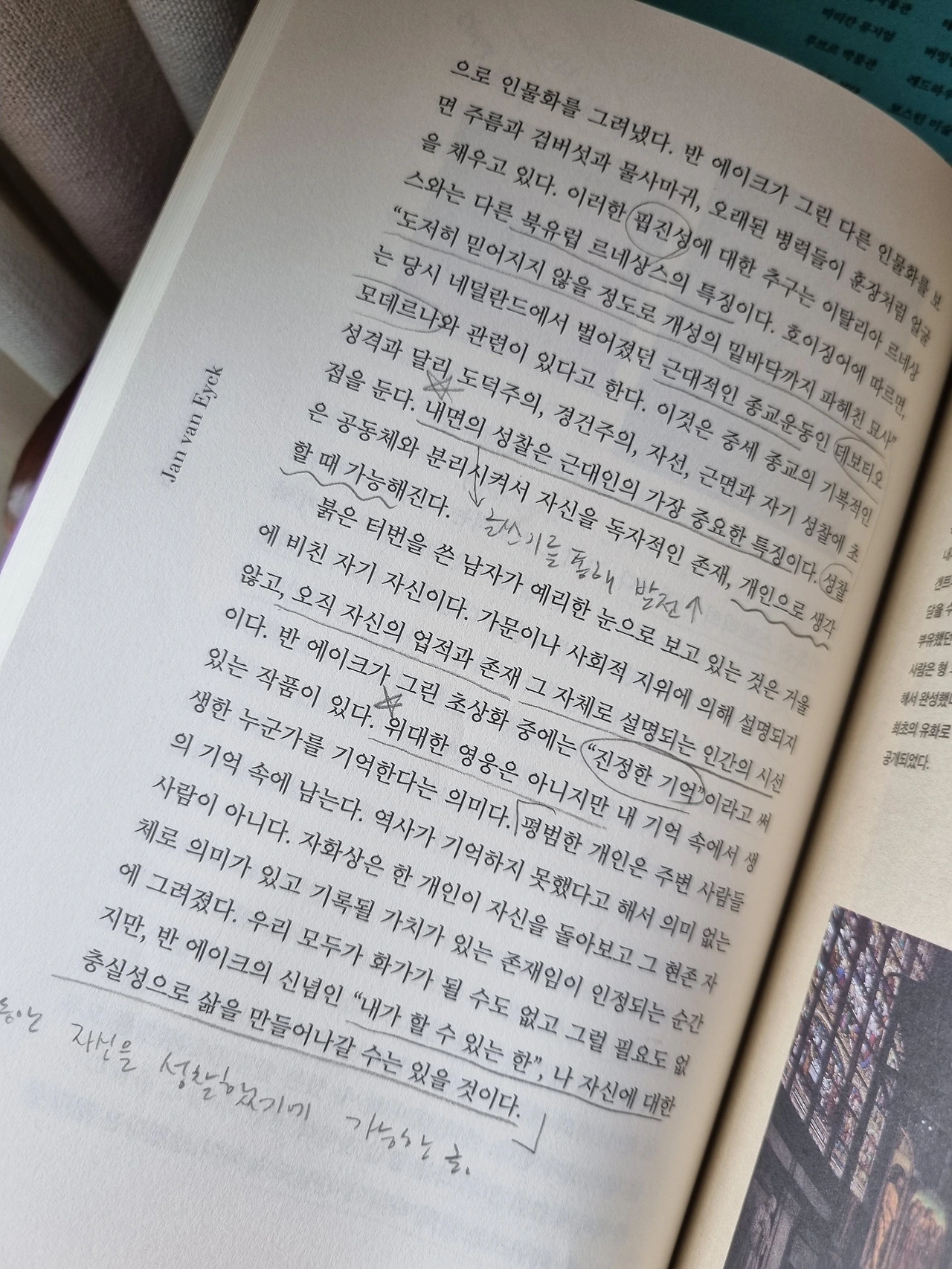 자신이 옳다고 생각하는 가치에 충성했다고 쓰인 루벤스의 이야기에서도 비슷한 생각들이 일었고 세상의 평판, 기준 따위와 싸우는 일에 자신의 힘을 낭비하지 않고 모든 재잘거림은 그저 흘러가게 둔 젠틸레스키에 대한 부분에서는 어쩐지 눈물이 나기도 했다. 그녀 삶에 유일한 상수가 그림 그리기였듯 나 역시 그런 시절을 지나온 터라 그림을 보며 위안을 얻듯 이진숙 작가님의 인간에 대한 따뜻한 시선에 치유받기도 했다.