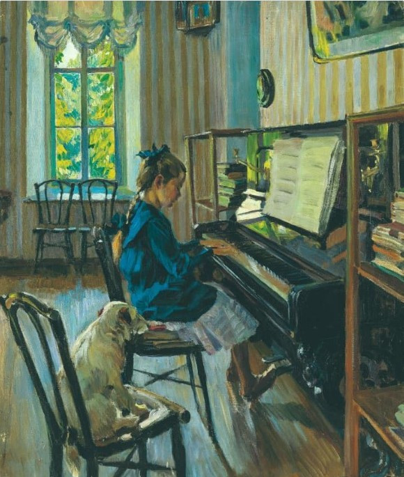 소녀의 의자 바로 옆, 등을 돌리고 앉은 하얀 강아지 한 마리가 보인다. 제법 나이가 들어 보인다. 아이의 연주를 집중해서 듣고 있는 듯하다. 세르게이 비노그라도프의 <피아노 앞에서>는 평범한 일상의 한순간을 그렸을 뿐이다. 하지만 그 일상 속에는 오랜 시간 축적된 정적의 무게와 그 정적을 묵묵히 견뎌온 시간이 담겨 있다.