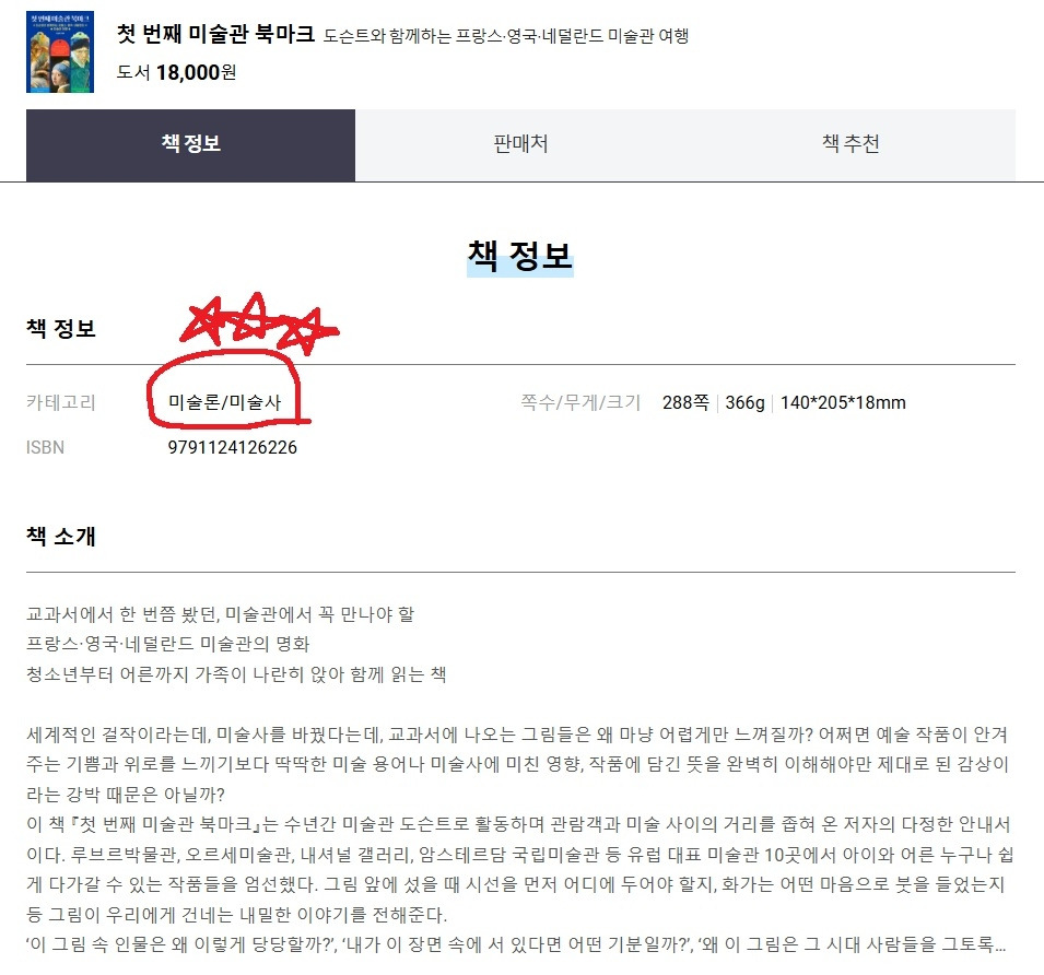 《첫 번째 미술관 북마크》가 그간 썼던 책과 남다른 이유. 오래 쓴 책이라서이기도 하지만 서점의 분류 기준에 드디어 ‘미술론/미술사’ 카테고리에 진입했다는 것. 누군가에게는 그저 데이터상의 분류일 뿐이겠지만 미술의 주변부에서 서성이던 나는 이제야 내가 있던 곳에 다시 발을 붙인 기분이다.
