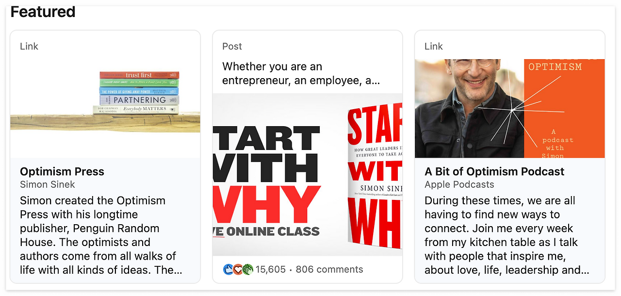 유명 작가인 사이먼 시넥의 Featured 섹션을 참고해 보자. 아래와 같이 메인 프로필 바로 아래 내 포트폴리오 하이라이트를 추가할 수 있다.