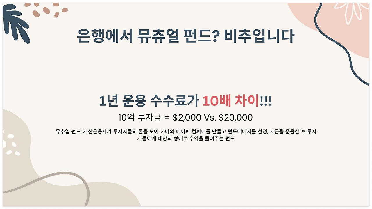 바로 수수료 때문이다. 뮤추얼 펀드나 ETF나 결국 비슷한데, 수수료만 거의 10배가 차이 나기 때문이다. 처음에는 투자금이 적어서 수수료가 0.2%던지 2%던지 상관없겠지만, 나중에 투자금이 불어나기 시작하면 연간 수수료에 어마어마한 차이를 보인다. 10억 투자금을 30년 동안 모았다고? 수수료만 일 년에 1800만 원 차이다!